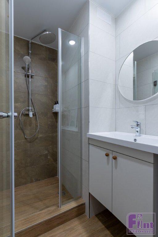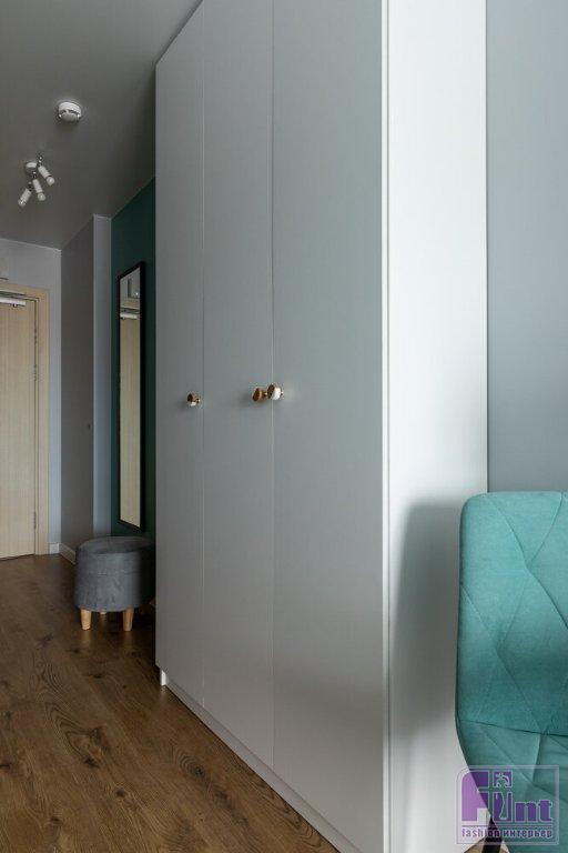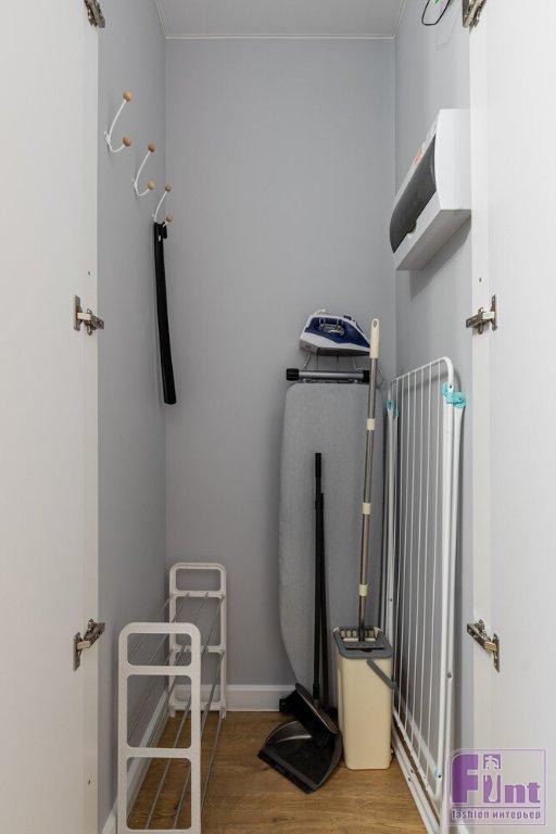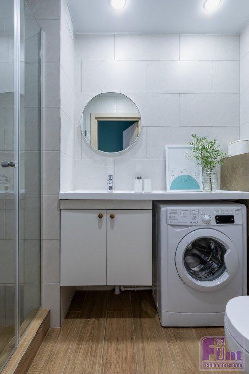В прихожей в нише вместо шкафа сделали только дверцы, что позволило существенно сэкономить бюджет, а также обустроить удобное место для хранения дорожных чемоданов, так как в нише нет дна шкафа, функцию которого выполняет пол. В санузел к деталям от застройщика добавили зеркало, тумбу под раковину и декор. «Я хотела добавить бирюзовый цвет в постере, но так и не нашла нужный, поэтому написала его сама, используя краску, которой красили стены в комнате», — рассказывает дизайнер. Именно поэтому картина стала весьма органичной частью обновлённого интерьера.