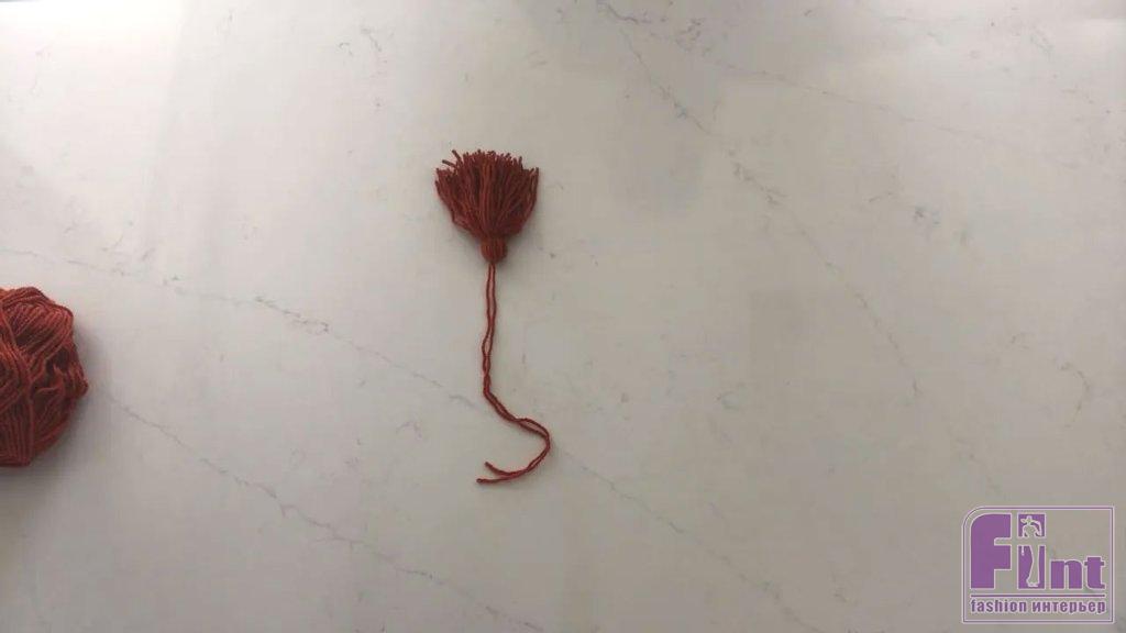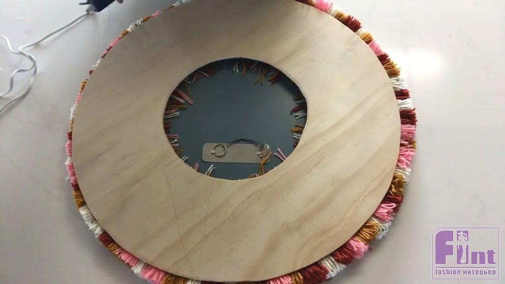 В интернете можно найти множество рекомендаций, как быстро сделать приспособления для изготовления помпонов и кистей. Проще всего это можно сделать по старинке, вырезав картонные круги с отверстием посередине нужного диаметра. Изготовление нужного количества кистей может занять много времени, но оно того стоит! После закрепления нитей в кистях, оставьте небольшой конец пряжи, который поможет вам крепить кисти к зеркалу.