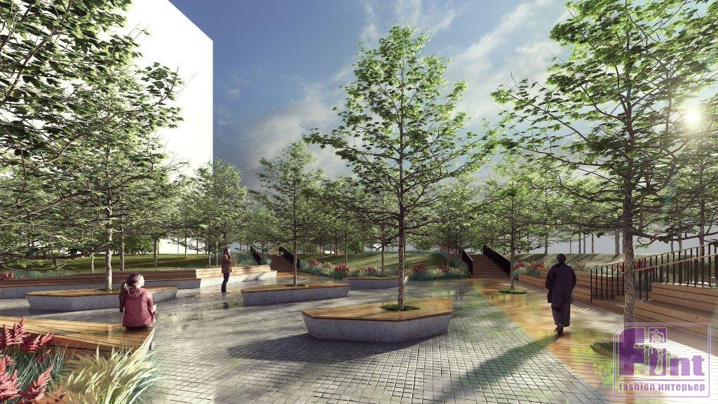 Прилегающее к зданию общественное пространство понравится людям всех возрастов. Детям придётся по душе ровная поверхность, по которой удобно кататься на велосипеде, самокате или роликах. Мамы с колясками оценят пологие пандусы. Пожилые люди после прогулки по парку смогут отдохнуть на удобных скамейках.
