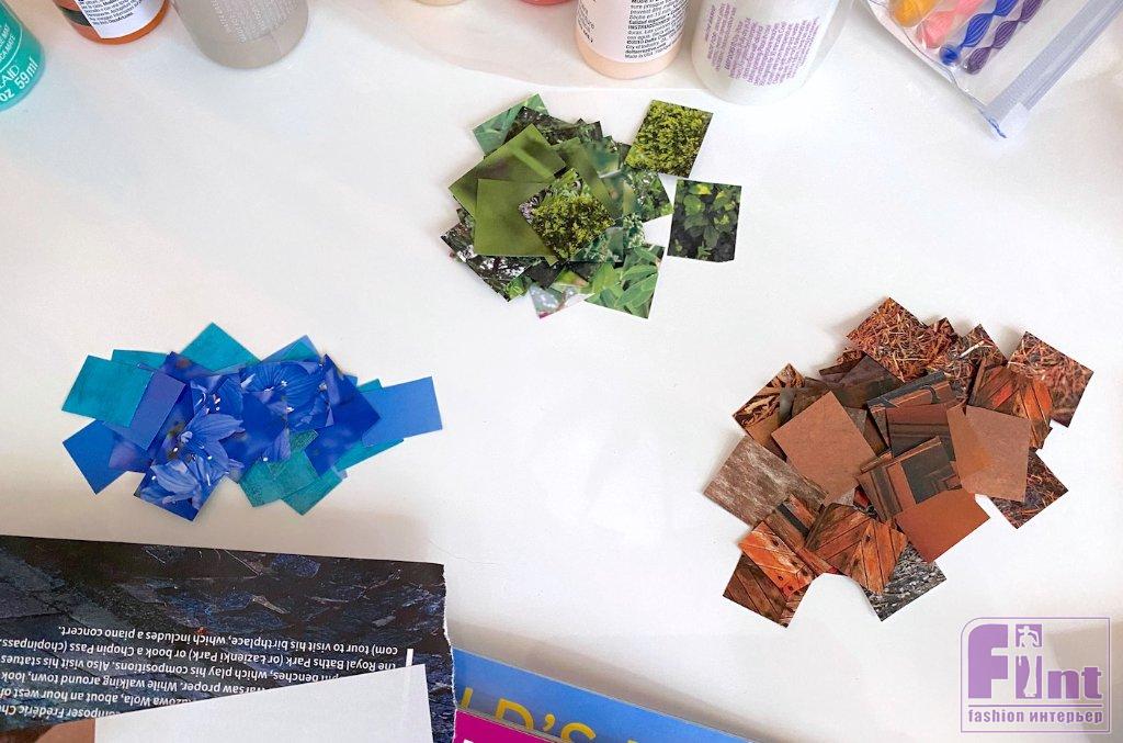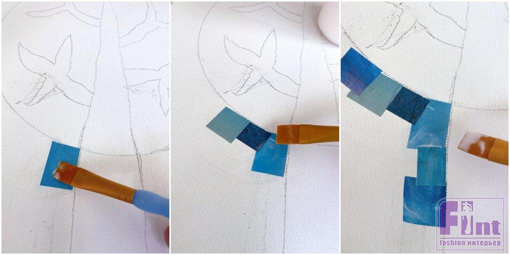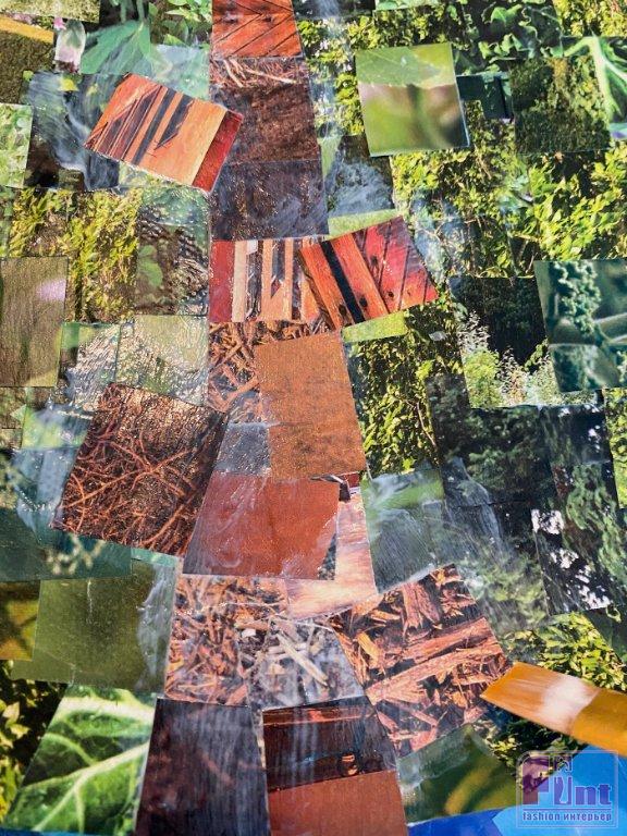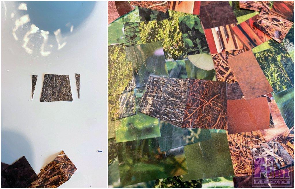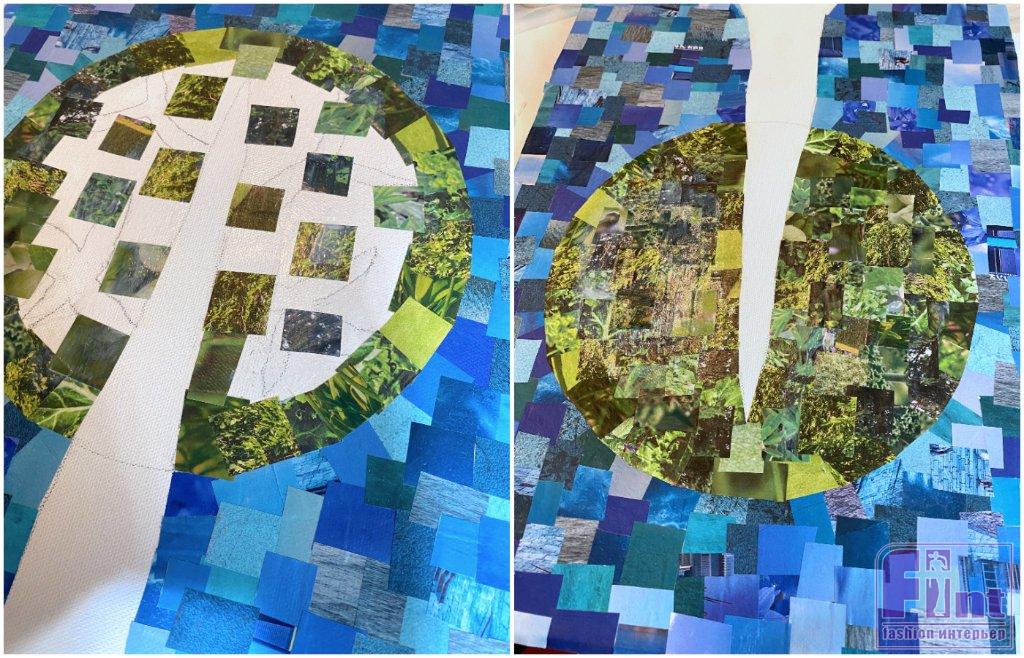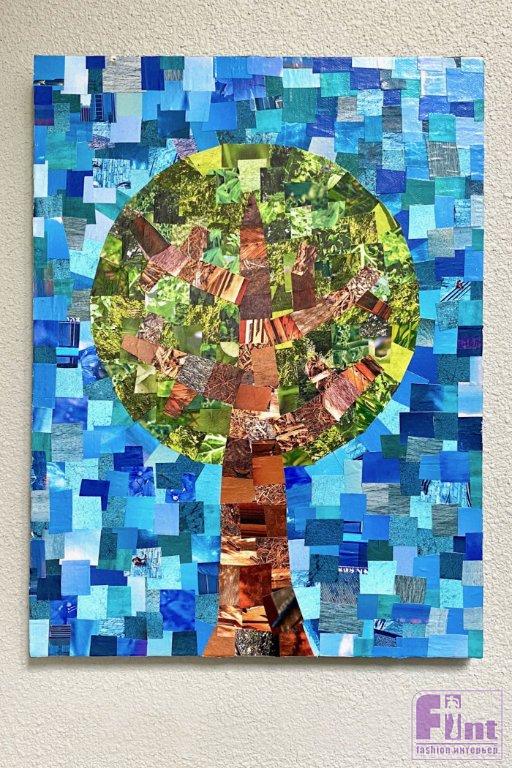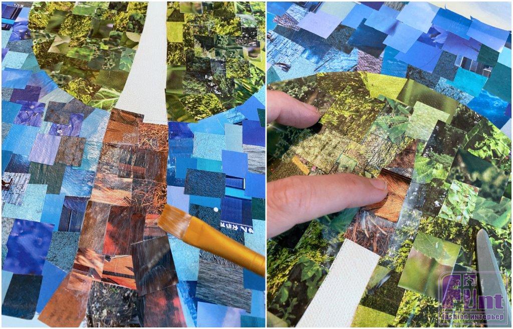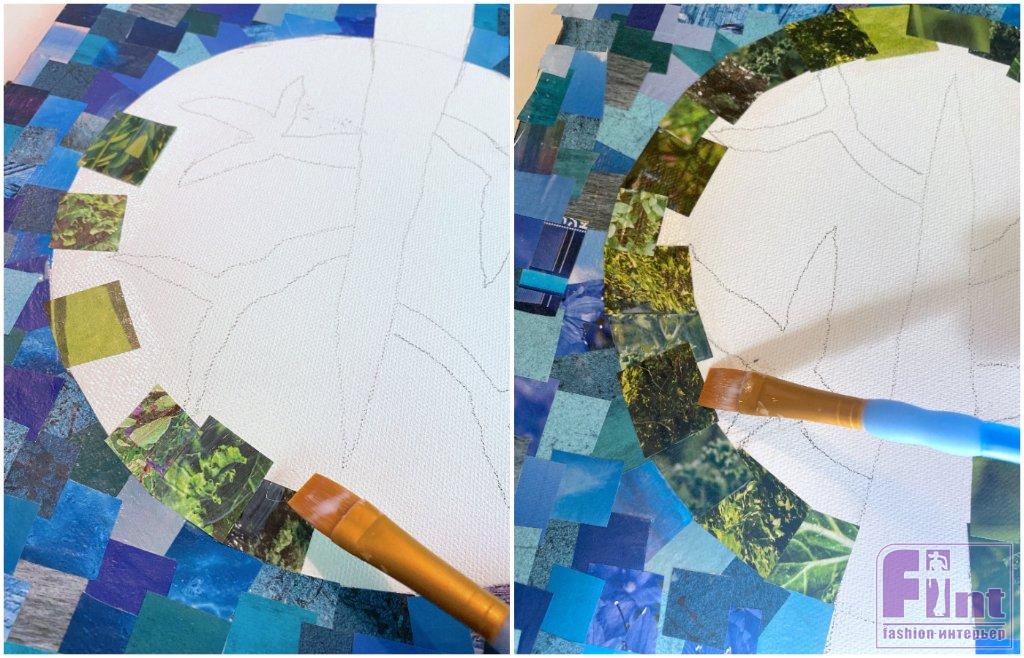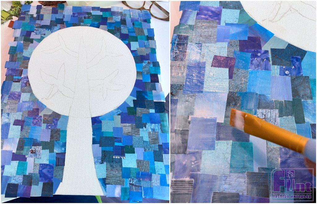 Отметьте на приклеенных зелёных фрагментах, где находятся ветви дерева, или сделайте снимок панно с помощью телефона.Прикройте зеленую зону кроны дерева кусочками журнала и дайте им полностью высохнуть.