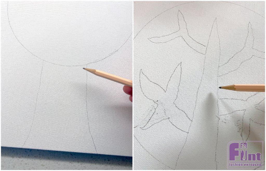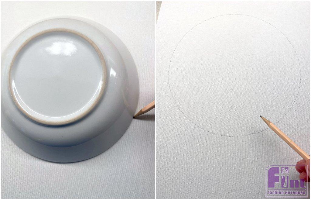 Поместите холст на рабочую поверхность и нарисуйте на нём свой дизайн. Мы выбрали стилизованное изображение дерева, поэтому используем круглую тарелку для разметки круглой кроны. Чтобы нарисовать ровную круглую крону дерева, поместите тарелку или другой круглый предмет в центр холста и обведите карандашом.