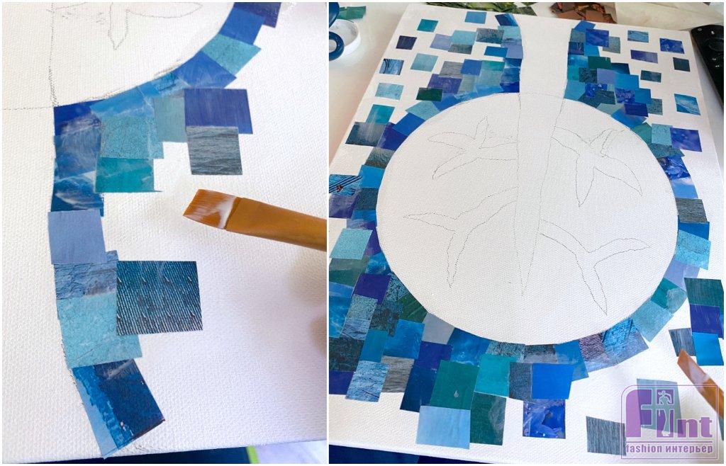 Работайте над основным дизайном, добавляя фрагменты журнала в различных оттенках синего.Расставьте их и накладывайте друг на друга различными способами, чтобы кусочки не выглядели как черепица, а создавали приятный мозаичный орнамент.