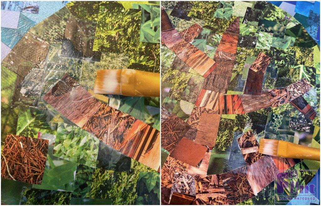 Возьмите зелёные журнальные фрагменты и начните оформлять лиственную крону дерева.Нанесите клей-лак, поместите в него зелёные фрагменты, двигаясь по кругу.