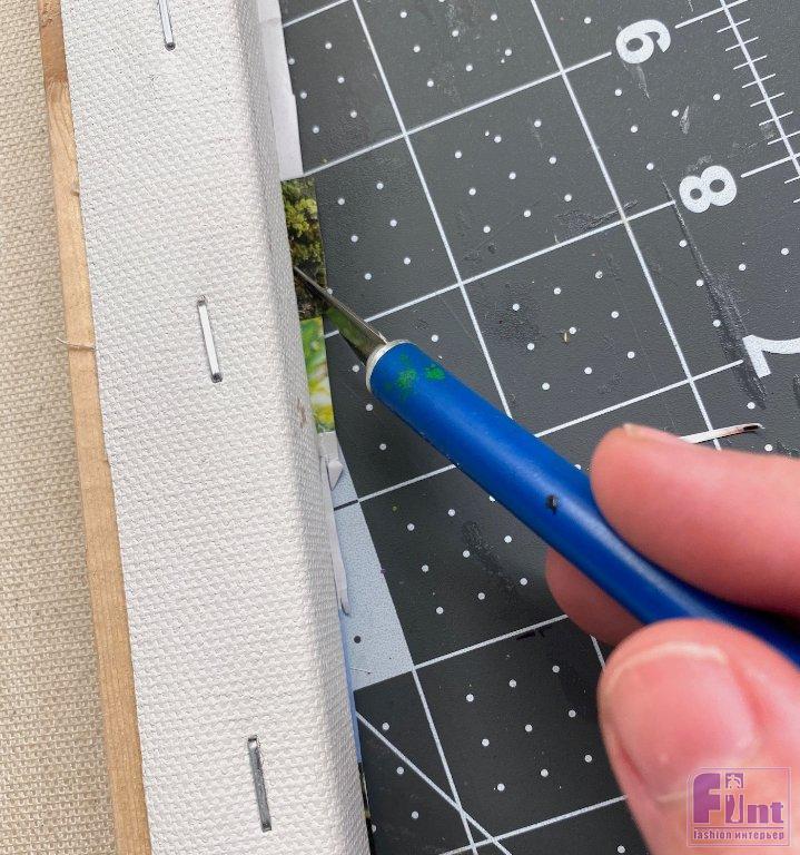 Переверните холст, и обрежьте края мозаичного коллажа с помощью ножа для рукоделия.