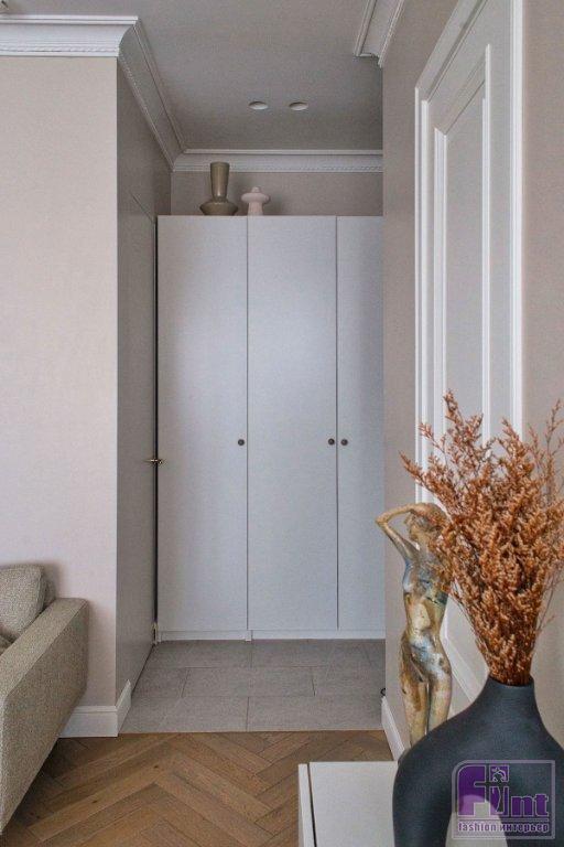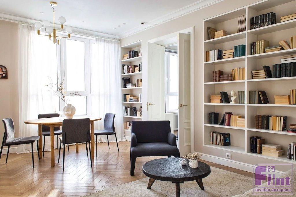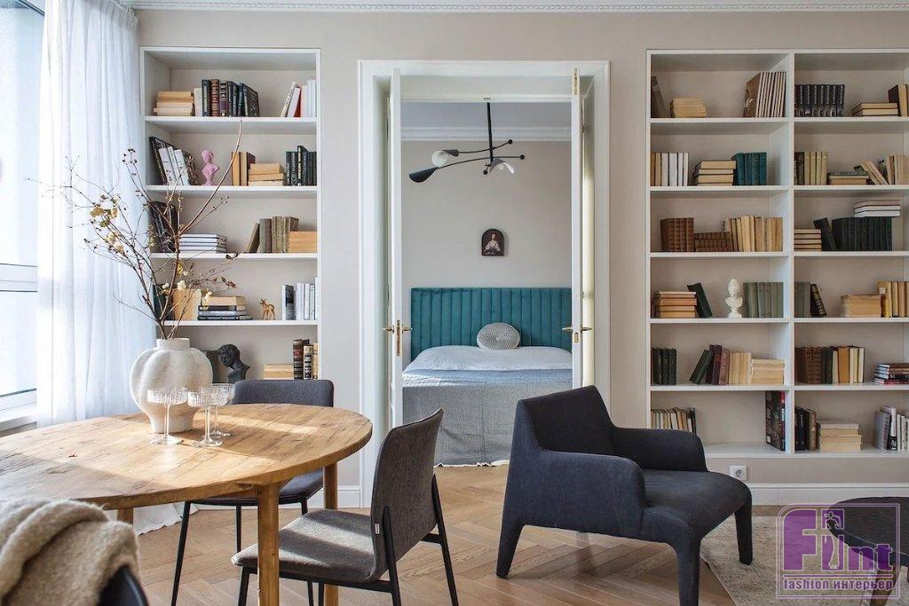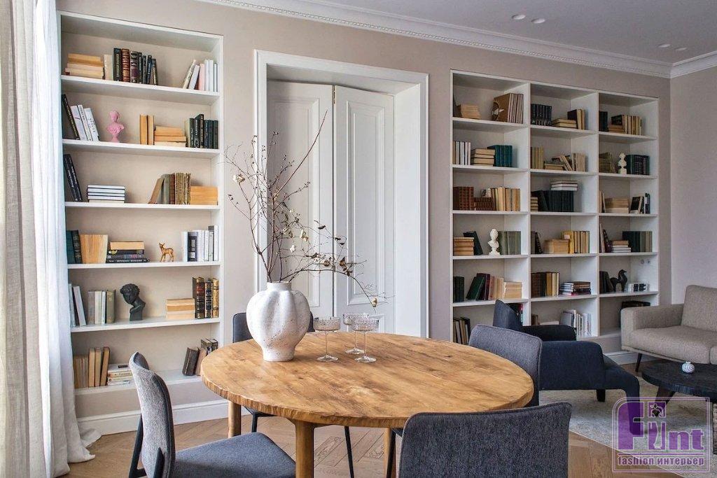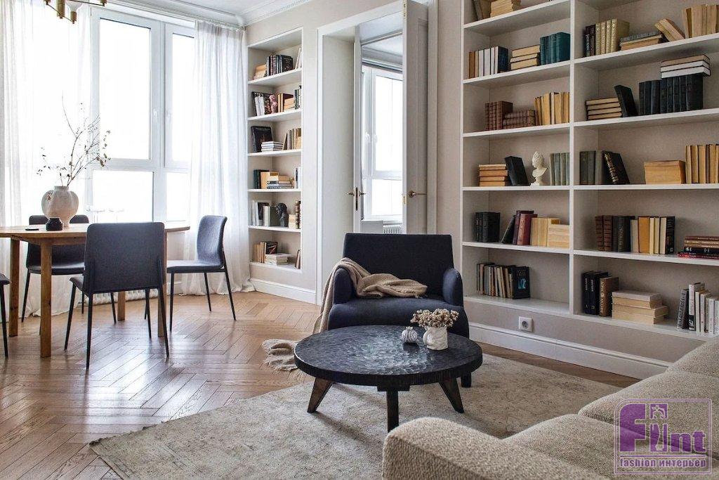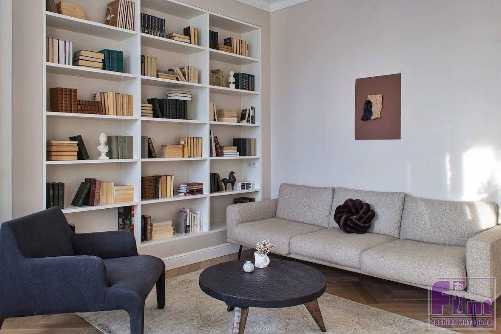 За счёт того, что в квартире продумали два важных «узла» для хранения — гардеробную и постирочную — это позволило освободить пространство от отдельно стоящих шкафов. Он один — в прихожей. Для обширной библиотеки хозяйки продуманы встроенные стеллажи в зоне гостиной — для этого на этапе планировки специально выстроили перегородки с нишами нужного размера, стеллажи встроены заподлицо со стеной. Для дополнительного хранения в гостиной продуман небольшой комод — он в транзитной зоне между прихожей и комнатой.