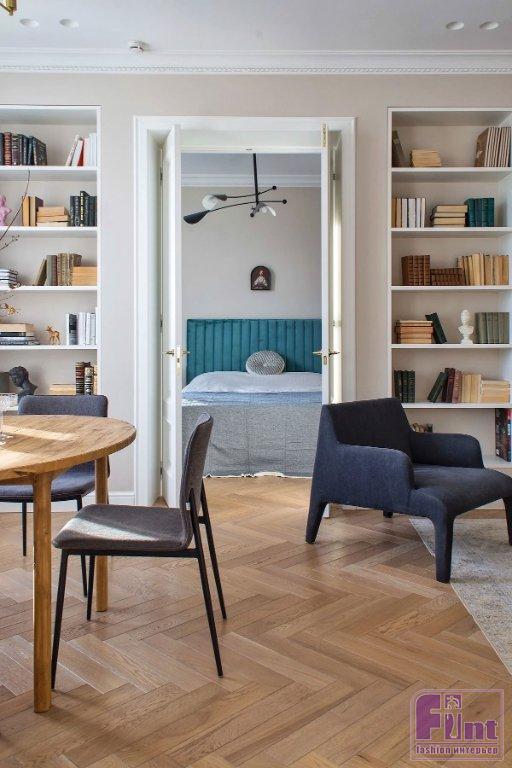 Владелица этой квартиры — молодая девушка. У хозяйки квартиры большая коллекция книг, и одним из главных пожеланий к дизайнеру Евгении Бушуевой было наличие в будущем пространстве квартиры обширной библиотеки. Квартира предназначалась для одной хозяйки, которая хотела создать «изысканную, но неприхотливую обстановку», как описывает задачу сама Евгения.