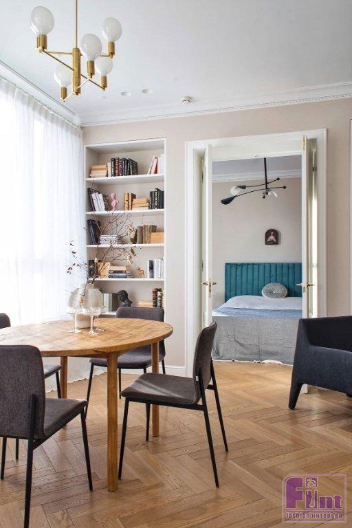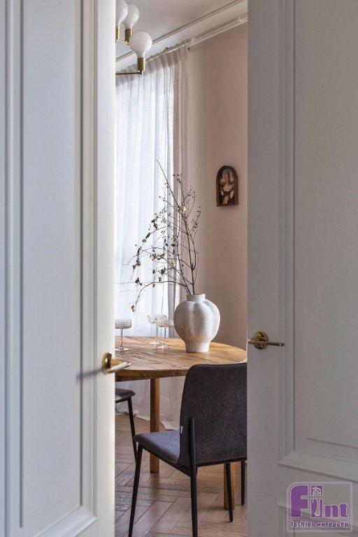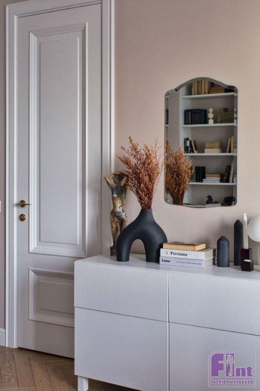 «Заказчица, молодая девушка, металась между французскими и скандинавскими интерьерами. В итоге нам удалось создать нетривиальный микс! С одной стороны — простота в отделке и лаконичность мебели, с другой — изысканность лепнины и анфиладная планировка. Во всех помещениях использовался один цвет — бежевый. Цвет сложный, перед окончательным выбором было сделано много выкрасов», — рассказала Евгения о своём проекте.