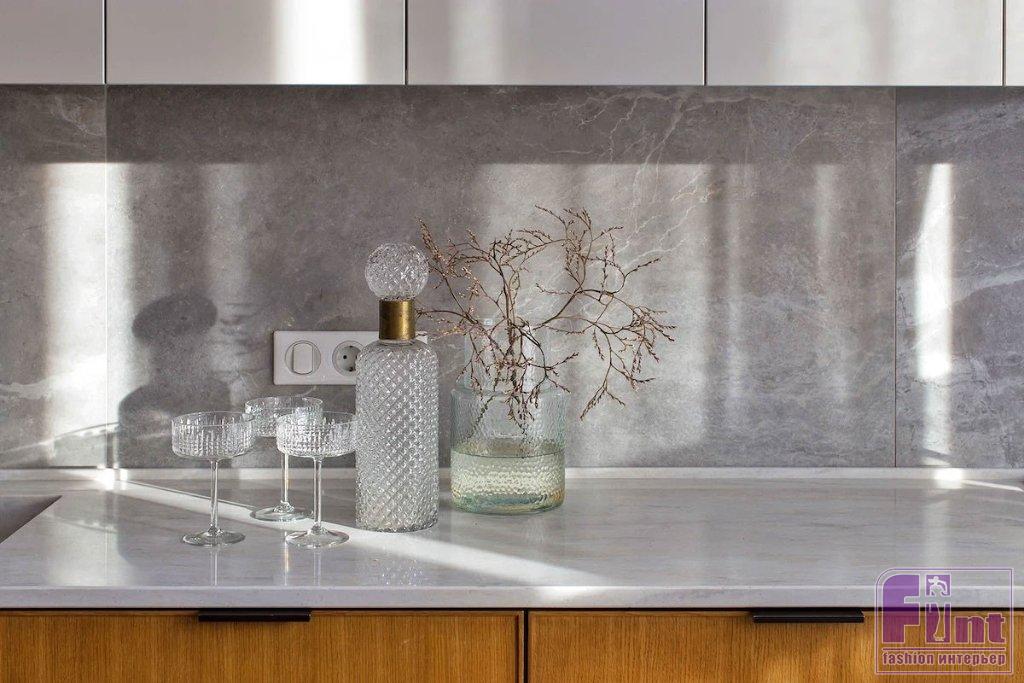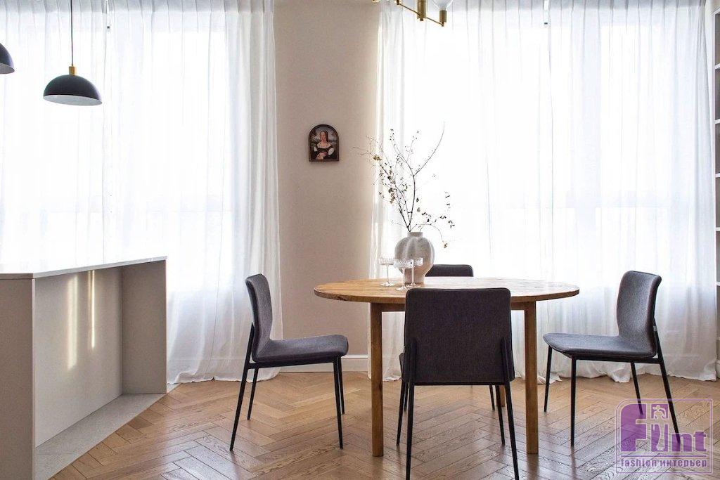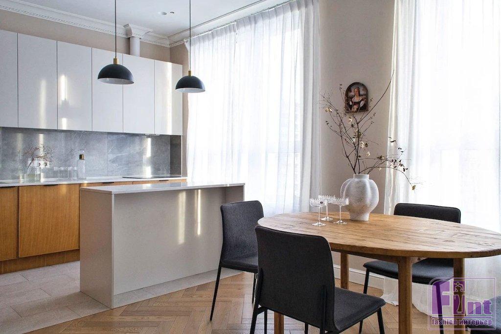 Мебель в современном стиле создаёт удачный баланс с классическими приёмами отделки (лепнина, паркет «елочкой», филёнчатые двери). Кухонный гарнитур — также в современном дизайне. Основная масса фасадов выполнена под дерево, верхние шкафы — белые матовые без ручек. Зонирующим элементом между зоной кухни и гостиной выступает кухонный остров.