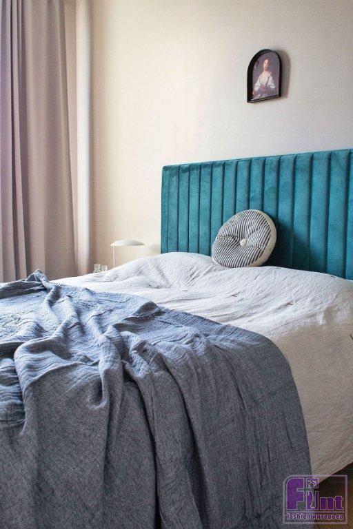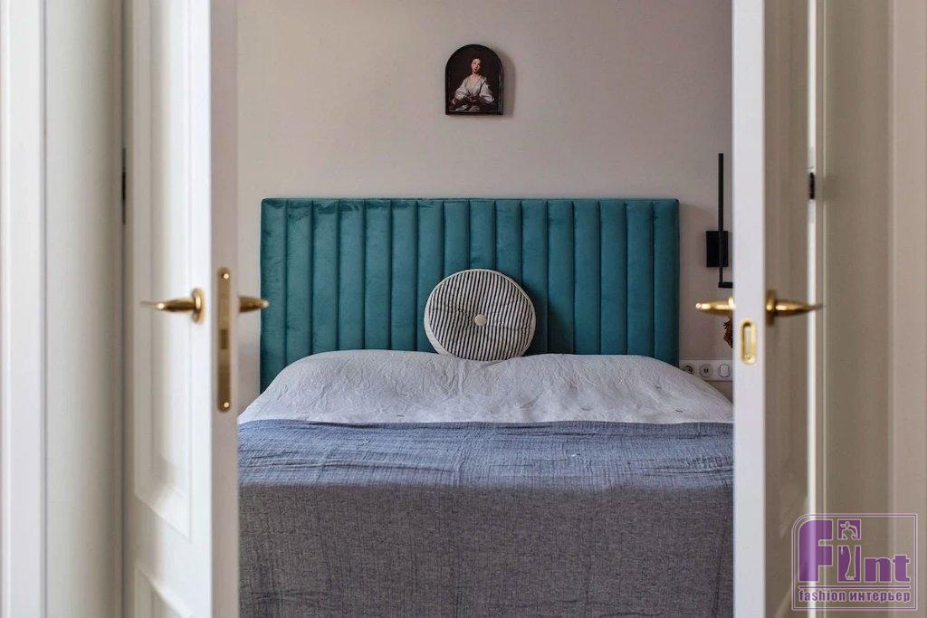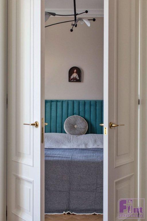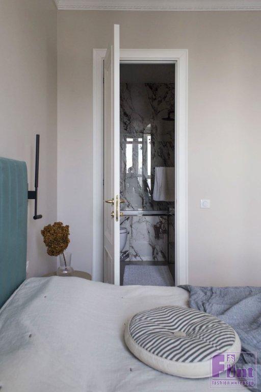 Так, в квартире получилась объединённая кухня-гостиная, из неё — вход в спальню через двустворчатые двери. «За счет того, что заказчица отказалась от телевизионных зон, нам удалось сделать анфиладный переход из спальни в гостиную с помощью двухстворчатых дверей! Это добавило пространству ещё больше воздуха и роскоши», — комментирует Евгения.