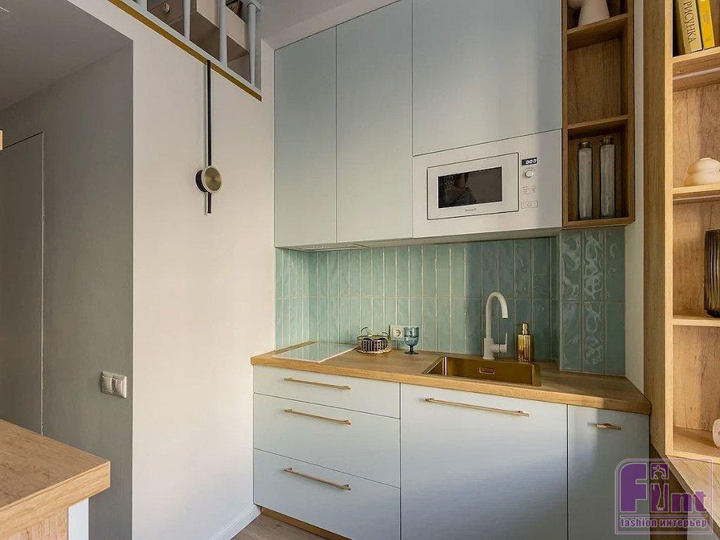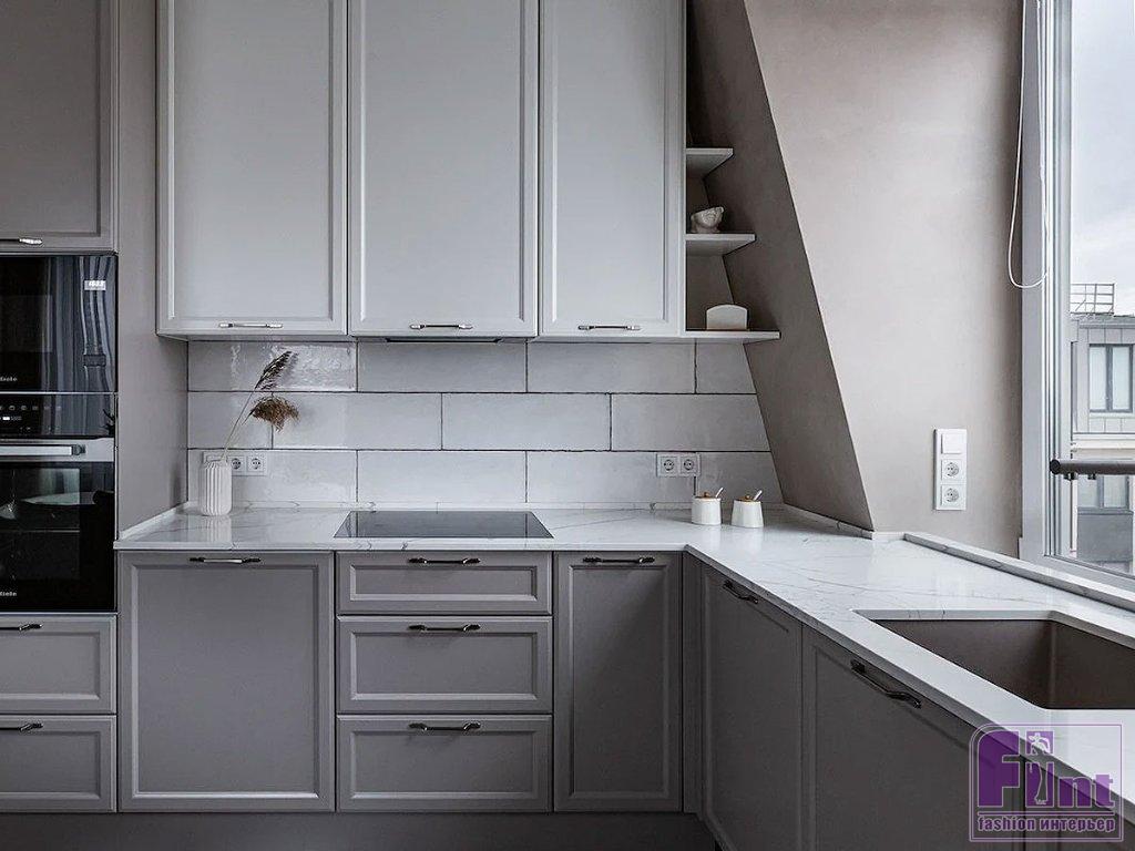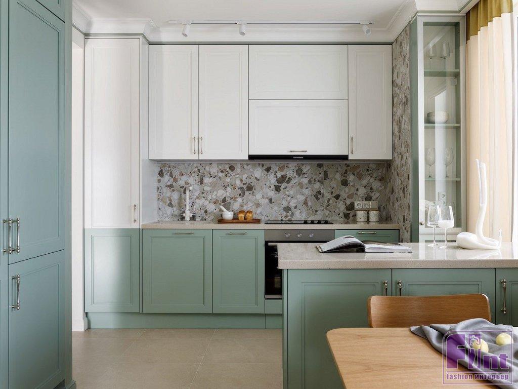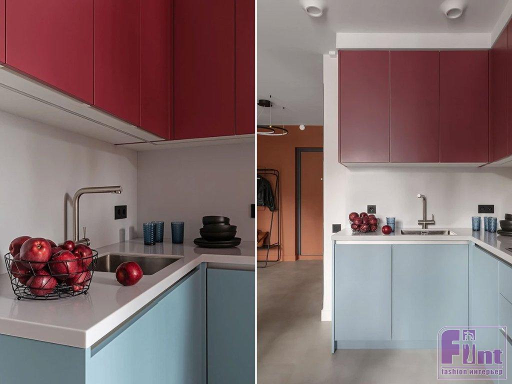 Комбинация столешницы и фартука также очень распространена, и технически это даже более простое решение, чем сочетание с фасадами. Вы можете сделать оба элемента из одного материала (например, пластика или МДФ-панелей), и тогда вопрос с цветом вообще не придётся решать.
