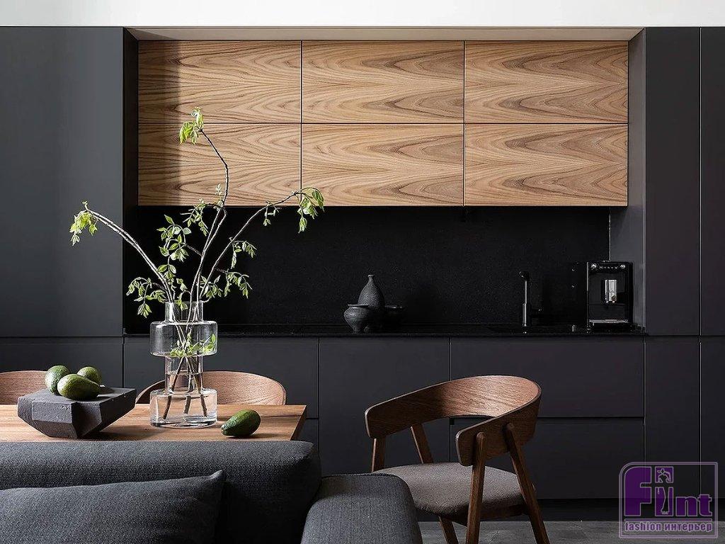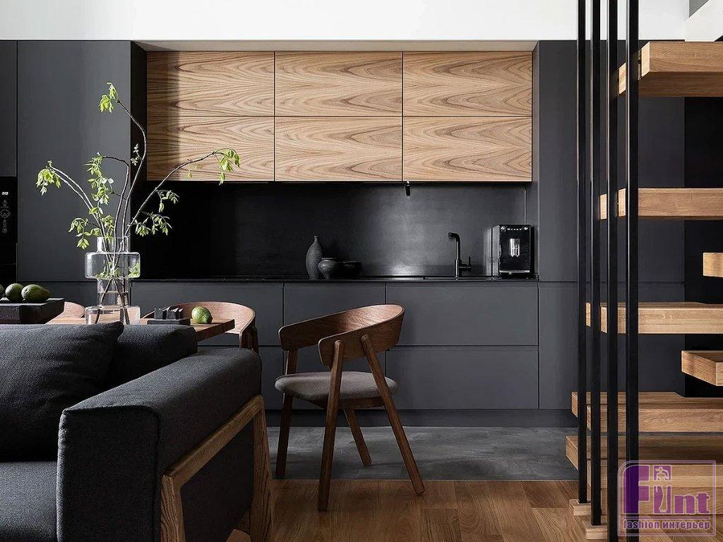 Самое простое, что можно сделать, — выбрать столешницу в близком или точно таком же цвете, что и кухонные фасады. Но здесь важно понимать, что обычно материал рабочей поверхности и фасадов отличается, а значит, и палитра оттенков будет разниться. Такое решение наиболее выигрышно для помещения, где мебель выбрана в простом цвете: белом, чёрном, коричневом.