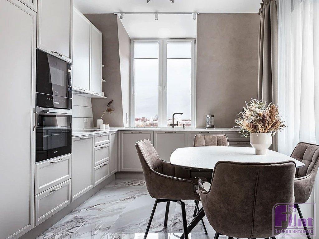 Чтобы вся кухня не превратилась в скучный монохром, используйте акценты: например, можно сделать контрастный фартук или подобрать выразительную фурнитуру для шкафчиков. Либо можно поставить двухцветный гарнитур, один из оттенков которого и будет дублировать столешница.