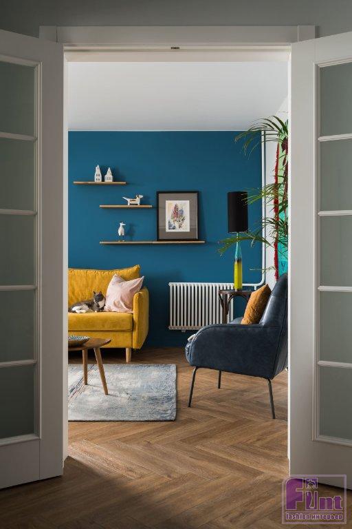 В квартире использована преимущественно покраска стен. Заказчикам хотелось иметь возможность в дальнейшем менять цвет стен и подкрашивать сколы и повреждения в процессе использования. Для акцента в гостиной выбрали ритмичную тему — простой и недорогой прием, который помог оживить интерьер.