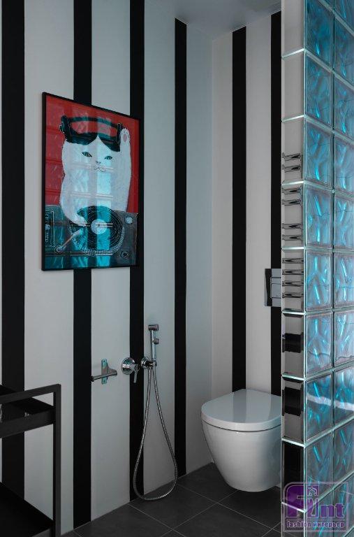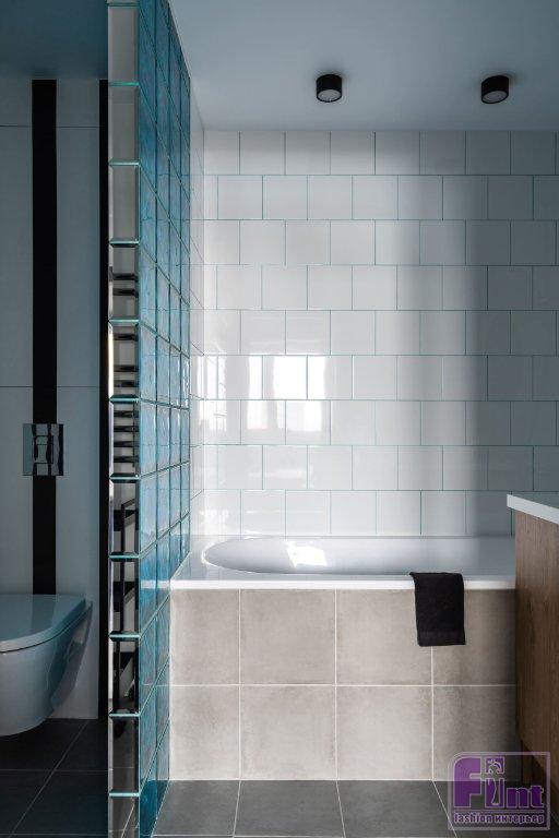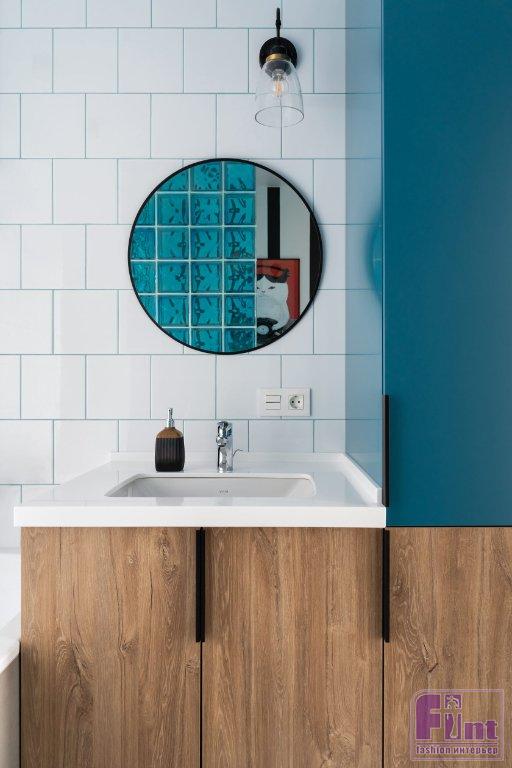 В ванной и на кухне использовали плитку и керамогранит. «В санузле я предложила выстроить перегородку из стеклоблоков, чтобы условно отделить зону туалета, а также создать необычные тени от насыщенного цвета стекла», — рассказывает дизайнер.