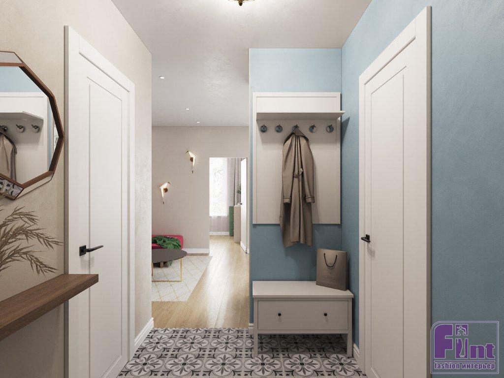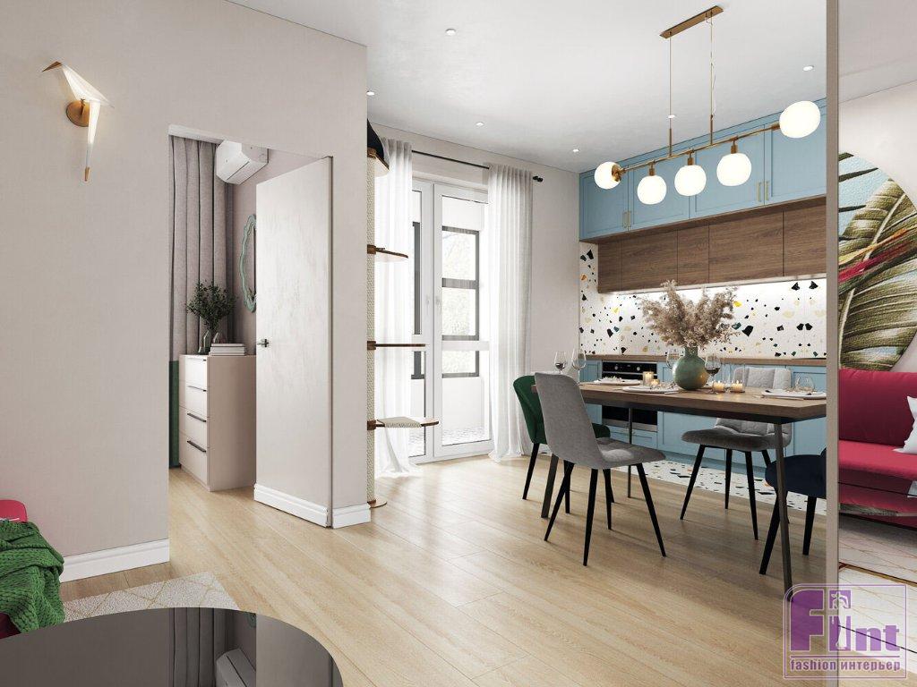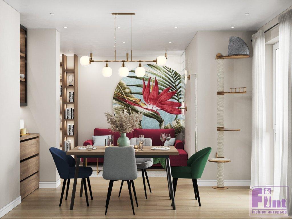 Практикующий дизайнер интерьеров Анастасия Смагина совместно с сервисом Room To Me придумала жизнерадостный интерьер для молодой заказчицы и её двух кошек. Девушка мечтала о ярком и живом интерьере, в котором будет комфортно жить, и куда можно приглашать много гостей. На 47 квадратных метрах нужно было продумать большую кухню-гостиную с зоной отдыха на лоджии, а также изолировать спальню. Ещё одно пожелание заказчицы — полноценная гардеробная.