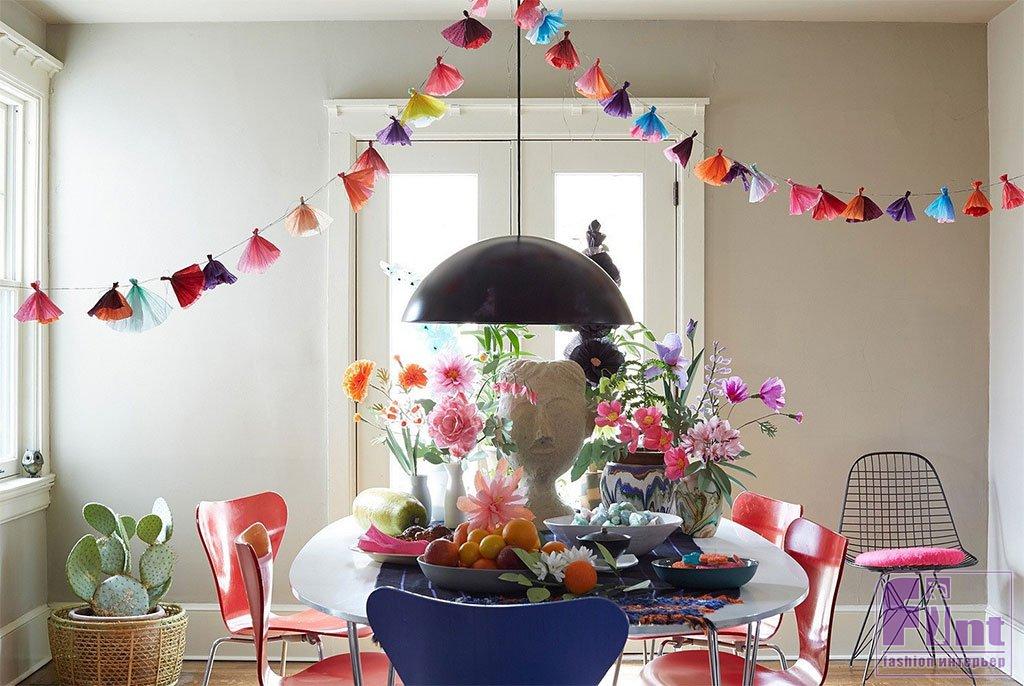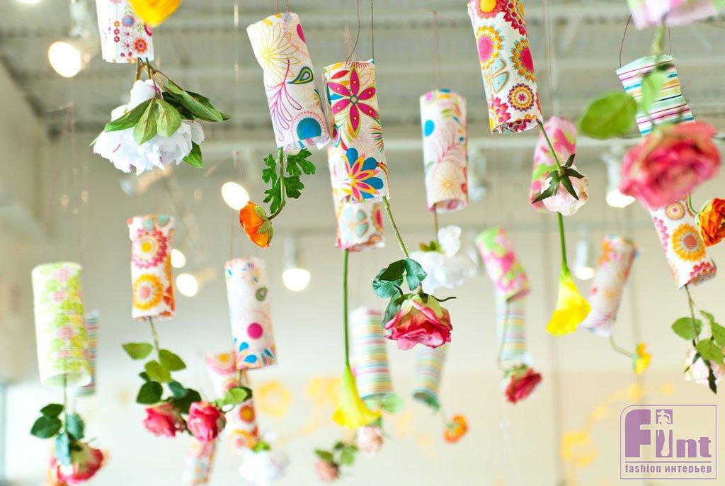 Замените скучные кашпо для цветов на подоконнике на яркие и необычные модели. Сделайте красочные цветочные композиции и весенние венки, украсив их бабочками из яркой бумаги, используйте различные вазы и другие подходящие ёмкости. Примените в оформлении праздничного интерьера атласные и шёлковые ленты. Однотонные обычные ленты можно повязать на спинки стульев бантом, более яркими лентами можно подвязать шторы или украсить светильники и люстры.