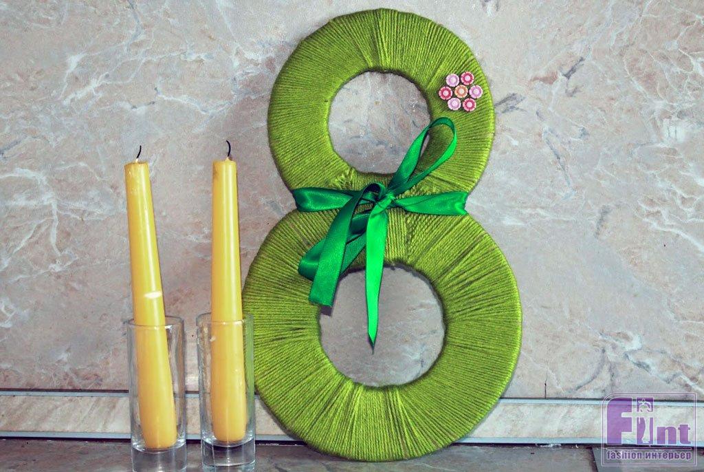 Празднование Международного женского дня не обойдется без цифры 8. Оформляется она по-разному. Место ей отводится исходя от типа помещения, уровня предстоящего торжества, возраста прекрасных дам. Подбор материала полностью во власти декоратора. Для изготовления используется практически любой материал.