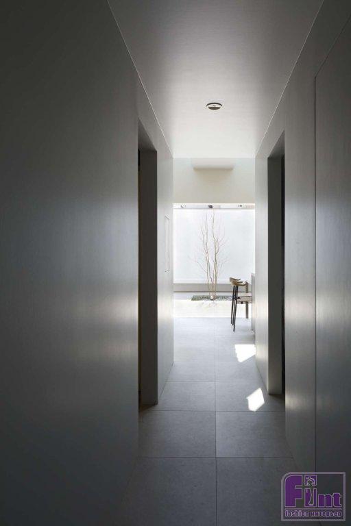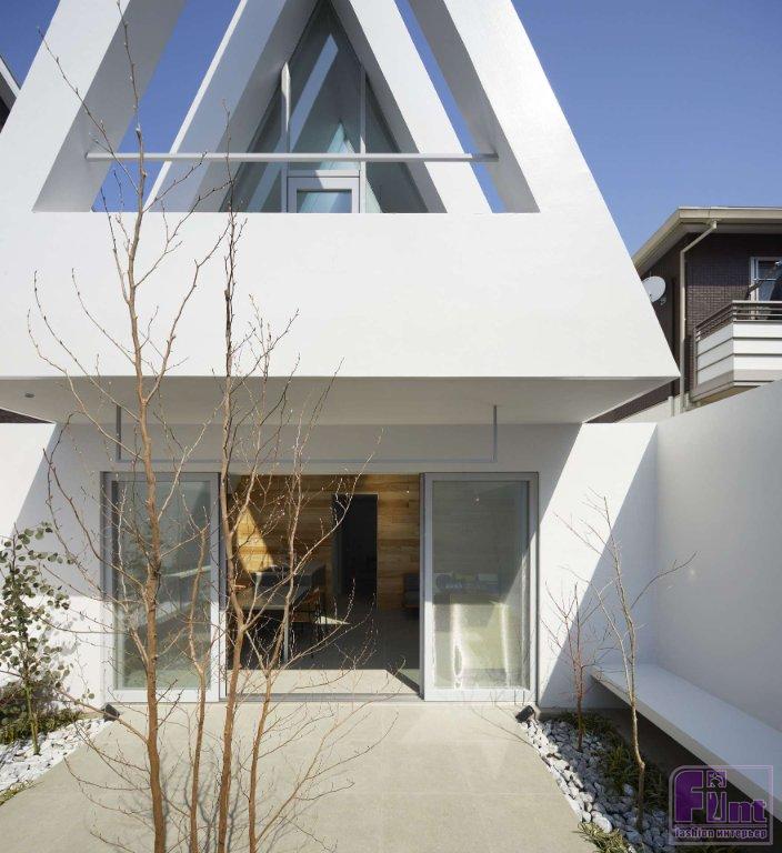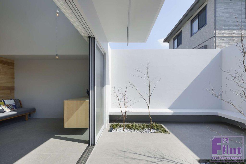 Придающий дому особую изюминку треугольный атриум накрывает прямоугольный первый этаж дома. Такая же по форме прямоугольная закрытая терраса спроектирована дизайнерами Airhouse в задней части резиденции. Несмотря на плотность застройки, терраса, как и весь дом, отлично освещены естественным солнечным светом. В передней части дома, обращённой на дорогу, сформировано зеркальное отображение террасы на заднем дворе, но с открытым пространством, открывающим фасад дома.
