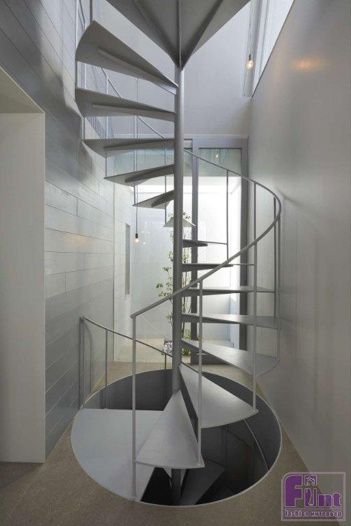 Первый этаж «Дома в Йокогаме» представляет собой прямоугольный объём, подчёркнутый простым входом с дороги. Сразу за входной дверью, жильцов встречает просторное помещение, выполняющее функции гостиной, столовой и кухни. Дальше в глубине дома дизайнеры Airhouse обустроили закрытую террасу, оживляемую солнечным светом в течение дня. Вертикальная связь дома выражена спиральной лестницей, соединяющей первый этаж с полуподвальным помещением, в котором находится спальня для гостей.