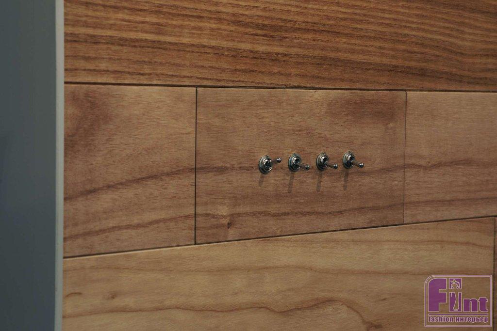Внутреннее убранство и дизайн интерьера дома построен всего на двух основных оттенках: белом цвете конструкций и цвете натурального дерева в мебели, напольных покрытиях и элементах интерьера. Единственным отличающимся элементом внутренней отделки является кухонный фартук, выложенный светлым натуральным камнем.