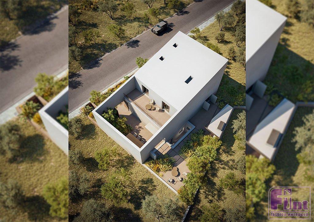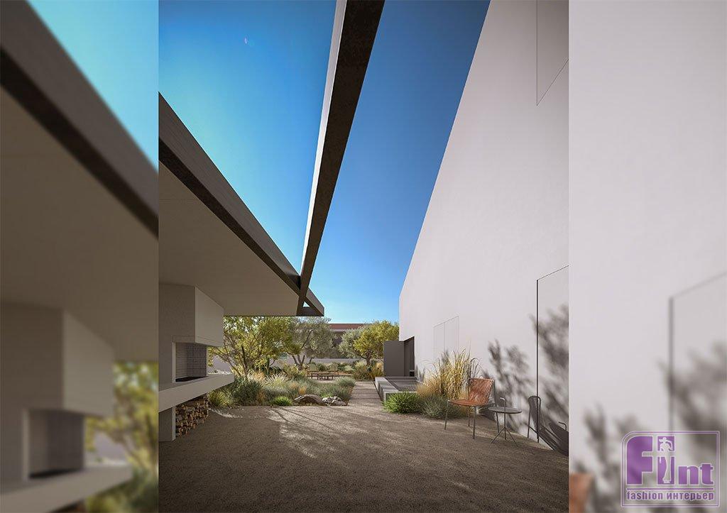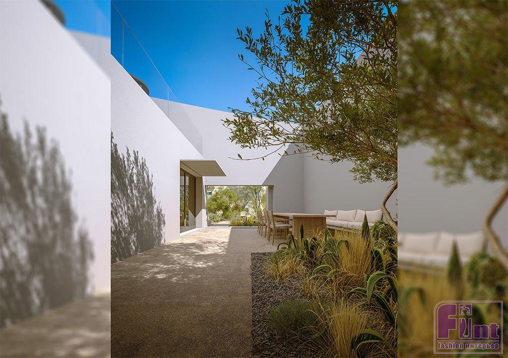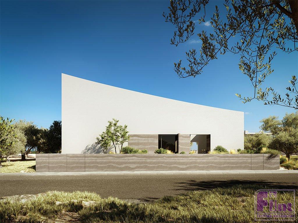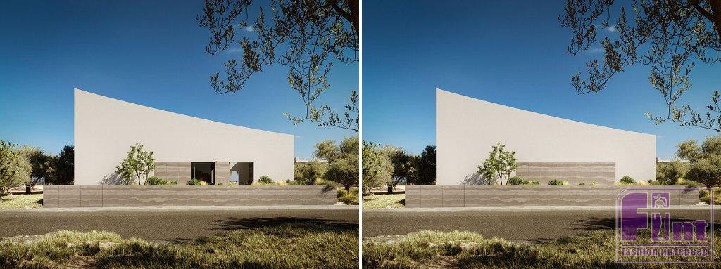 Греческим архитекторам удалось органично совместить в проекте суровый монолитный каркас с воздушным лёгким пространством внутреннего дворика под открытым небом. На западном фасаде дома установлены массивные ставни, которые при необходимости легко превращаются в большой входной портал, открывающей прямой доступ в гостиную дома. Между тем, на северо-восточной стороне есть серия ставней, изготовленных из того же белого материала, что и основная оболочка дома. Эта часть дома визуально воспринимается ещё более защищённой и неприступной, по сравнению с западной стороной строения.