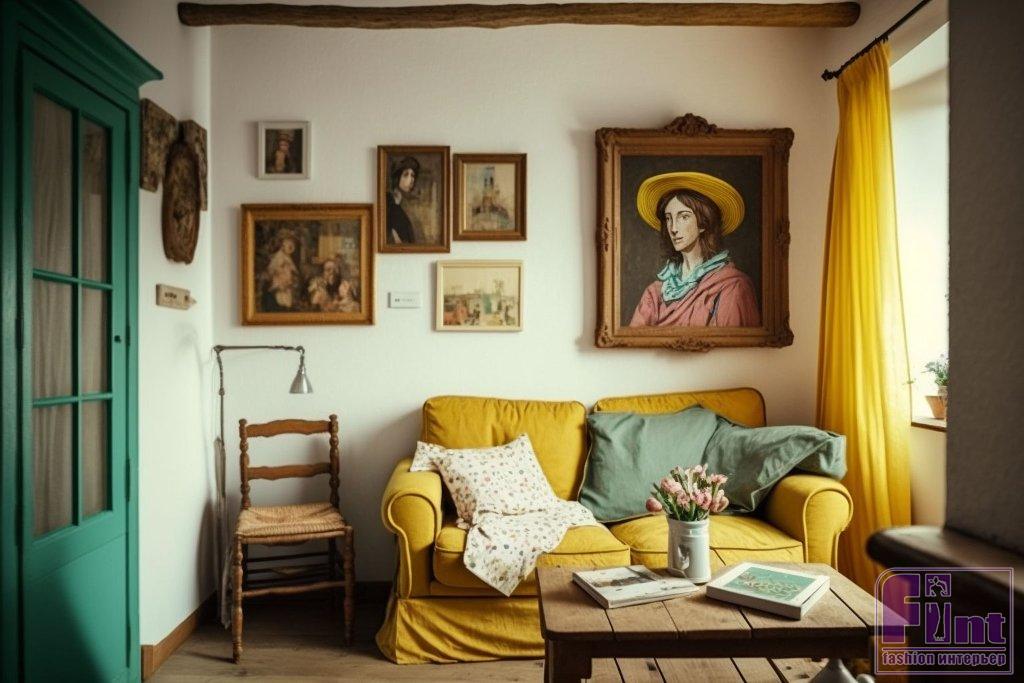 По сути, у нейросети получилась спальня художника в Арле в Провансе, только в виде гостиной, отмечают в Hoff. Так, жёлтая кровать художника трансформировалась в диван, зелёное окно — в шкаф в стиле кантри. Кроме того, в интерьере есть почти такие же деревянные стульчики с плетёными сиденьями и картины на стенах.