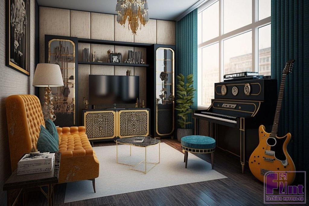 Комната американского короля рок-н-ролла ожидаемо получилась в стиле 1950−1960-х годов, когда в дизайне господствовал функционализм, но он становился ярче и эмоциональнее. Главные элементы интерьера — оранжевый диван, тумба с леопардовыми дверцами и шикарное пианино у окна.