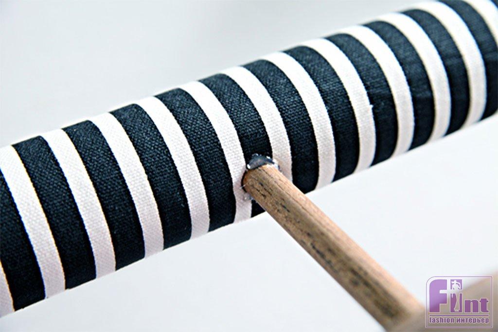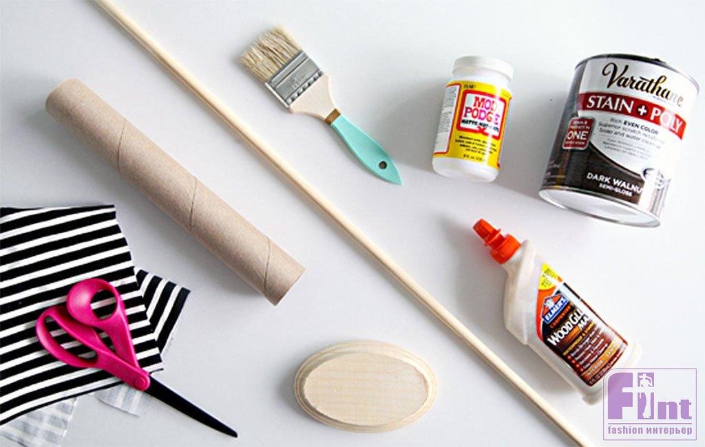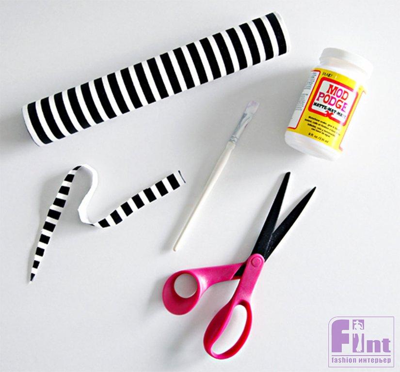 Затем, используя клей для ткани, клей-лак для декупажа или клеевой пистолет с горячим клеем, закрепите на картонной втулке отрезанный по её размерам кусок ткани. Остатки ткани с торцов втулки можно просто заправить внутрь и подклеить, или делать круглые картонные заглушки, обклеив их той же тканью. Сами заглушки приклейте аналогичным способом при помощи подходящего и имеющегося под рукой клея.
