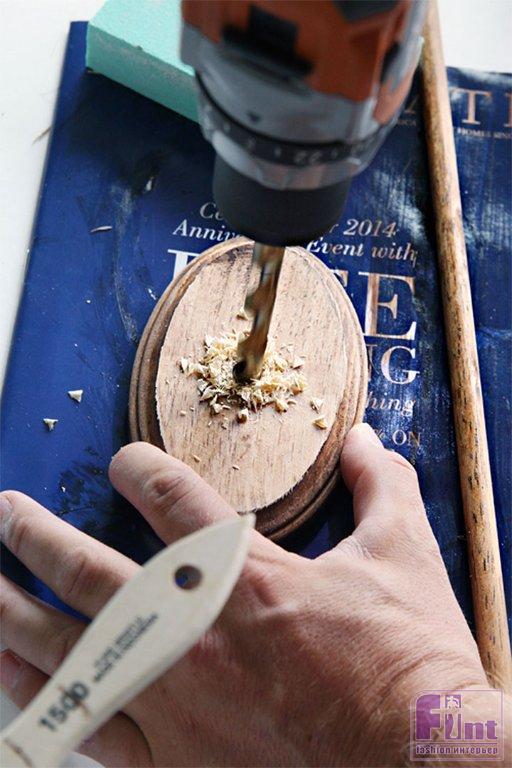 Мы решили обработать деревянные части будущего органайзера морилкой для дерева тёмного оттенка. На самом деле, деревянные часты вы можете декорировать по своему усмотрению, используя морилку различных оттенков, краску, или же оставить эти детали в их естественном виде натурального светлого дерева. Как только высохнет морилка, просверлили отверстие в центре деревянной плашки диаметром чуть меньше, нежели ваш деревянный дюбель.