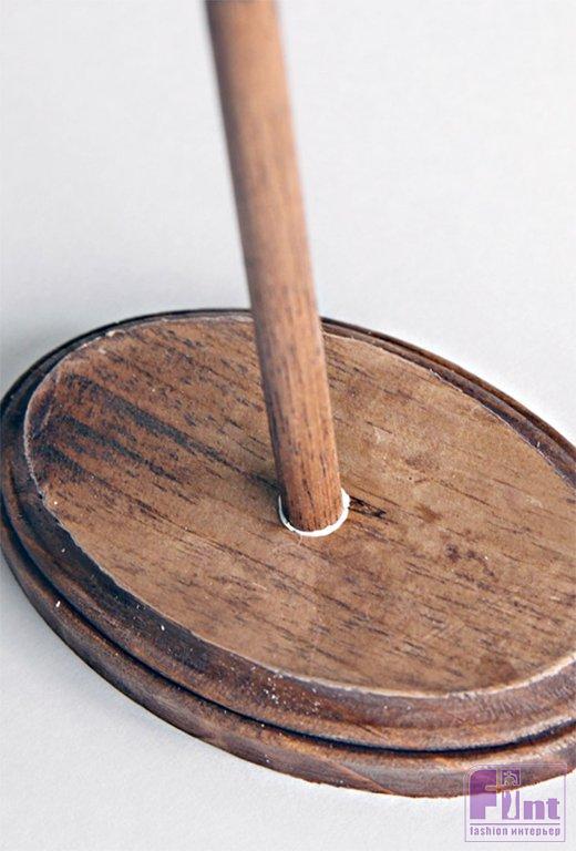 Вставьте предварительно отрезанный до нужной длины деревянный дюбель в просверленное отверстие в плашке. Предварительно капните в отверстие немного клея по дереву, чтобы надёжно зафиксировать дюбель в основании органайзера.