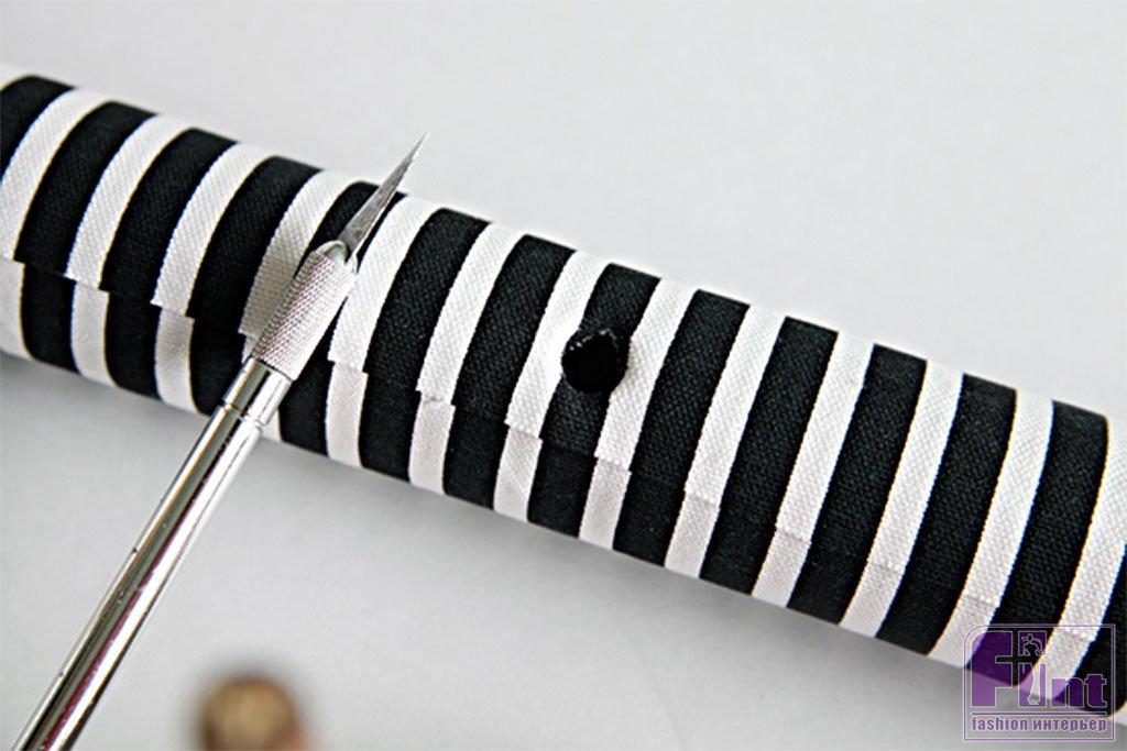 Используя острый нож для рукоделия, сделайте небольшой разрез в нижней части картонной втулки, обёрнутой тканью, чтобы сформировать отверстие.