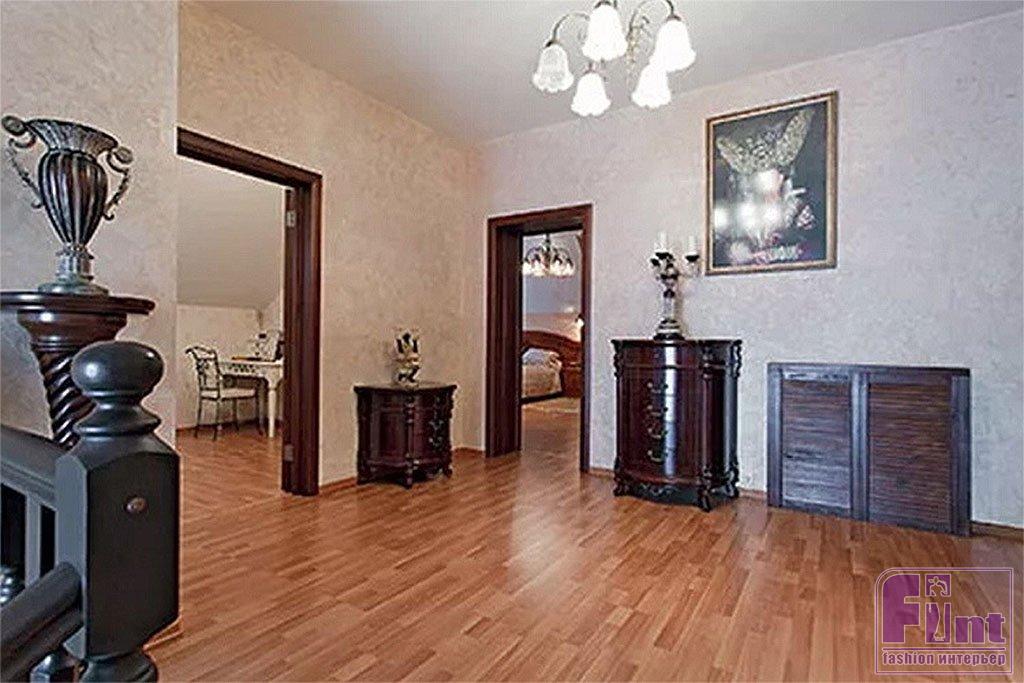 Лестница, ведущая на второй этаж, выполнена из древесины. Стены вдоль лестничного пролёта декорированы роскошными картинами. Высокое окно задрапировано нежным тюлем. Перед спальнями обустроен холл с уютной зоной отдыха, где можно расслабиться, сидя в комфортных креслах. Комнаты второго этажа отличаются более камерным оформлением. Пол комнат облицован паркетными досками с лаковым покрытием. На этом этаже обустроены спальни.