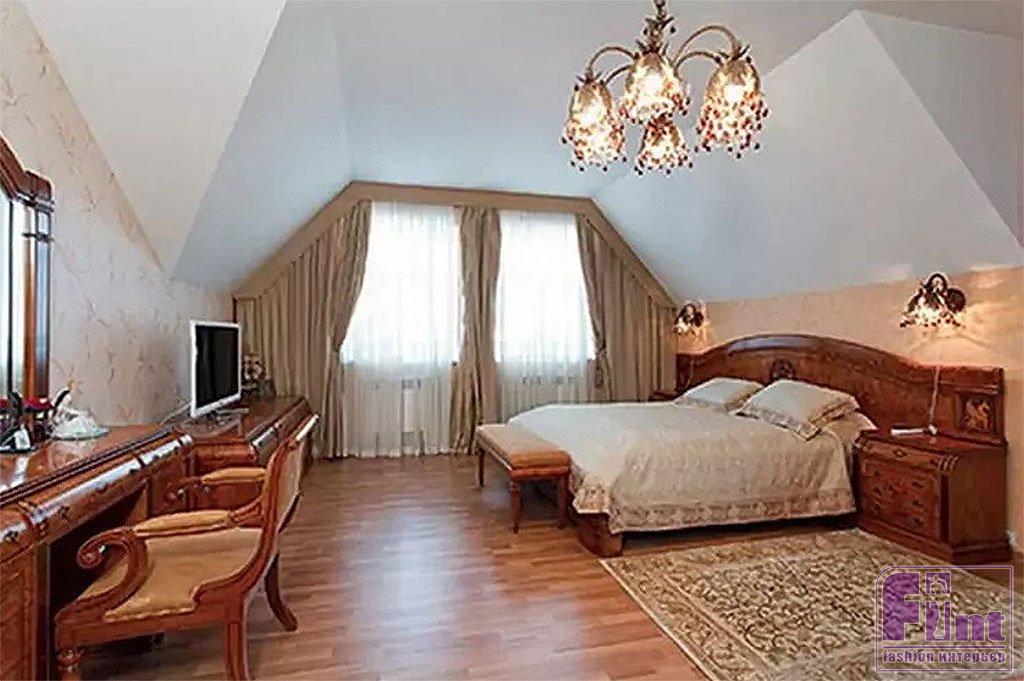 Интерьер одной спальни выполнен в стиле ампир, а интерьер другой комнаты имеет более современное оформление. Центральное место там занимает кровать с коваными элементами из металла. Спальня владельца дома освещается большой люстрой и настенными светильниками, выполненными в таком же стиле. В комнате присутствует много мебели из древесины.