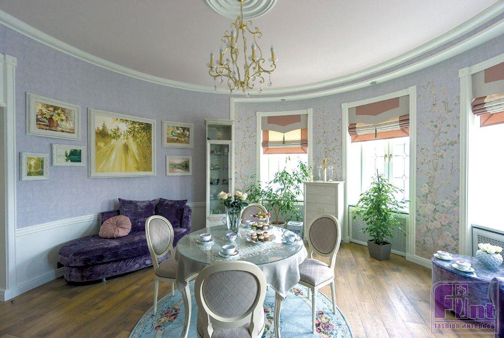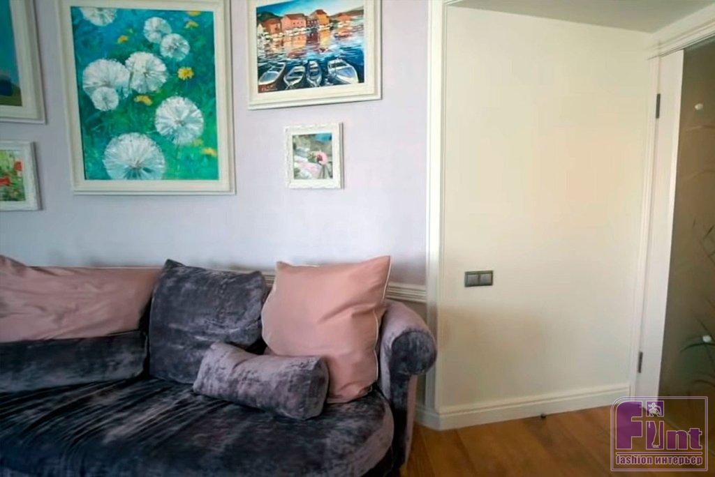 Татьяна Догилева собрала большую коллекцию картин. Для них были заказаны новые рамы из багета с перламутровым покрытием. Они идеально вписались в интерьер и удачно перекликаются с мебелью. Дополнили оформление красивые орхидеи на широких подоконниках и фикус в большом кашпо. В результате получилась роскошная гостиная, в которой Татьяна Догилева может устраивать ежедневные чаепития с близкими и друзьями.