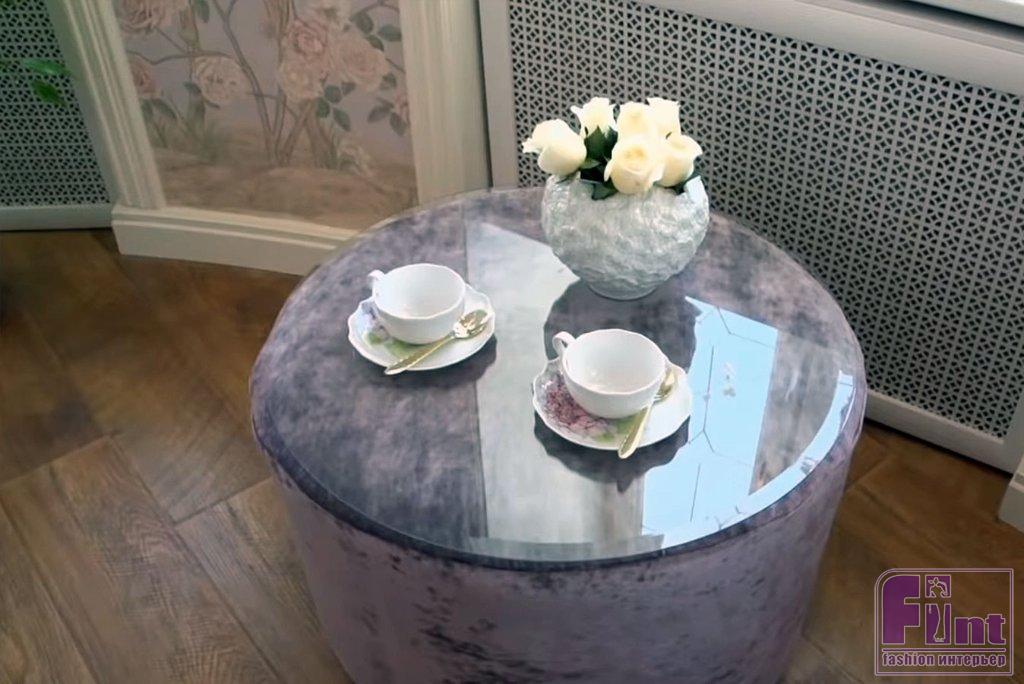 Дополнили обстановку роскошные диваны и кресла, обитые мягкой бархатной тканью из смеси хлопка и вискозы. Для пуфа заказали круглую столешницу из закалённого стекла, так что теперь это полноценный журнальный столик.