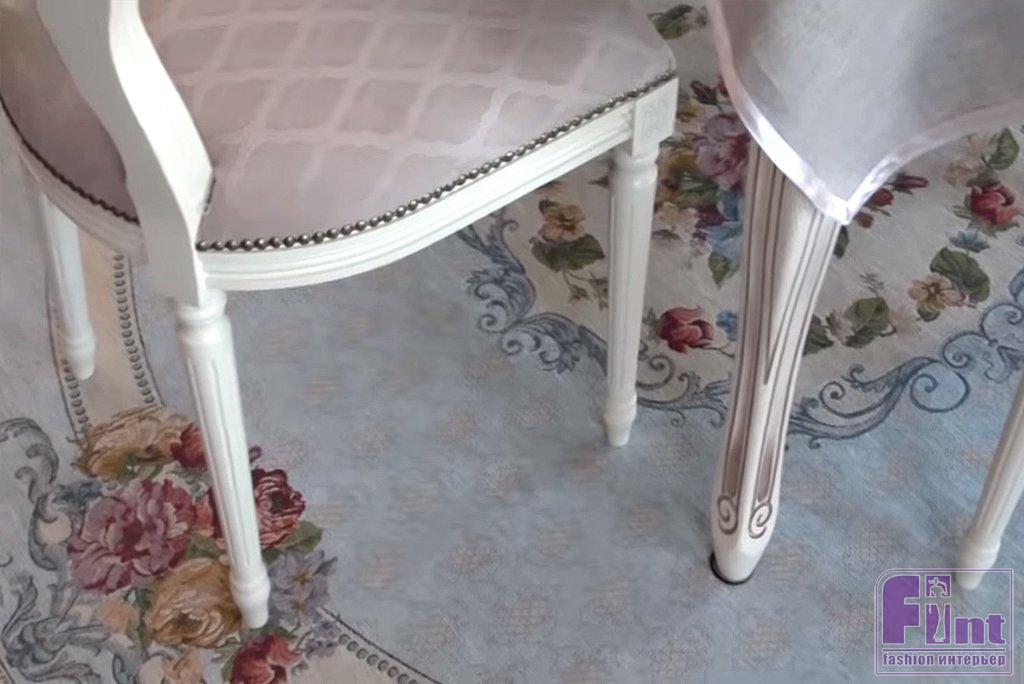 По центру гостиной положили шикарный ультрасовременный ковёр, его волокна имеют антибактериальные свойства и отталкивают не только грязь, но и запахи. На нём поставили раздвижной светлый стол из массива дуба с патинированной поверхностью диаметром 120 см. Ножки стола украшены очень красивой резьбой. Столешницу накрыли скатертью ручной работы и прозрачным закалённым стеклом. Вокруг разместили дубовые стулья, обитые флоком.