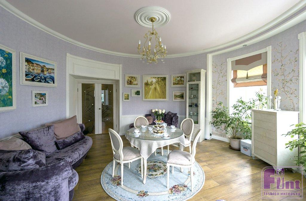 Татьяна Догилева собрала большую коллекцию картин. Для них были заказаны новые рамы из багета с перламутровым покрытием. Они идеально вписались в интерьер и удачно перекликаются с мебелью. Дополнили оформление красивые орхидеи на широких подоконниках и фикус в большом кашпо. В результате получилась роскошная гостиная, в которой Татьяна Догилева может устраивать ежедневные чаепития с близкими и друзьями.