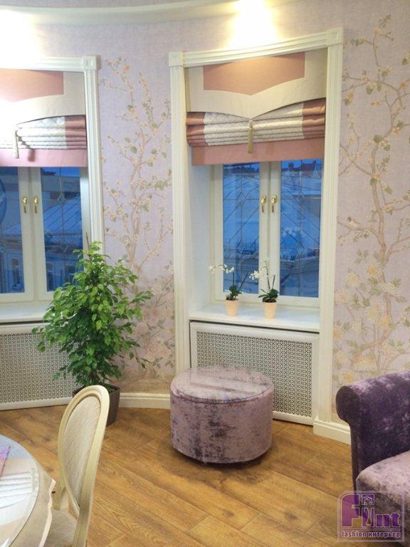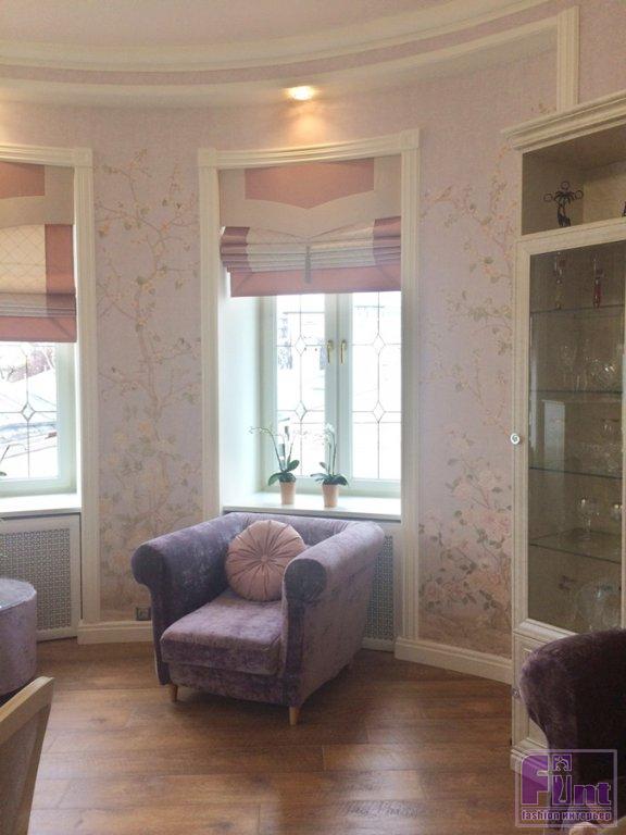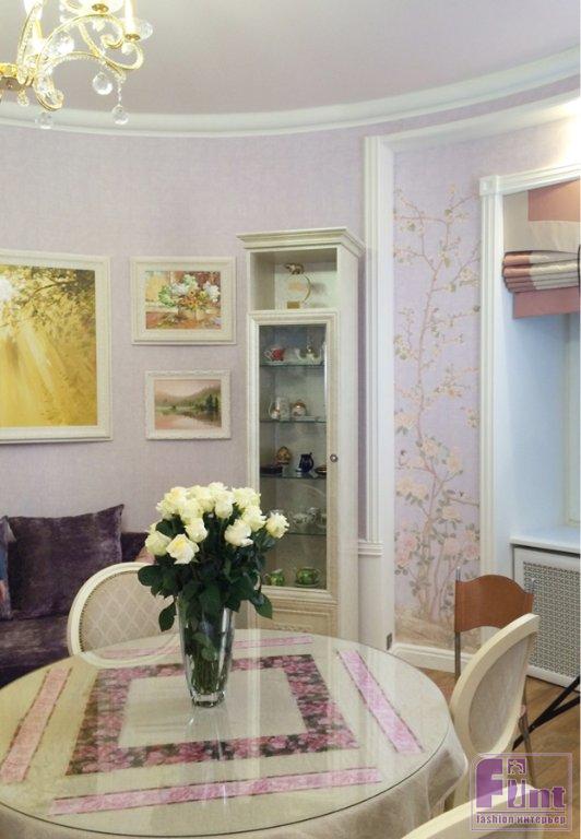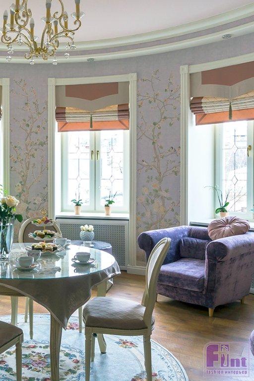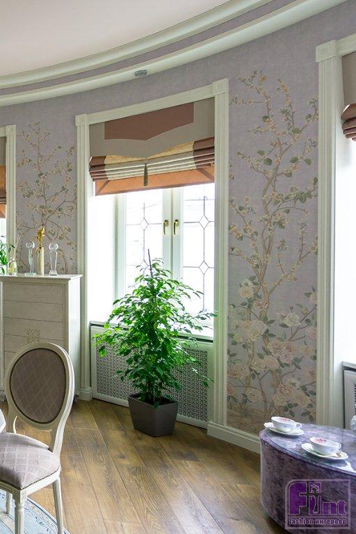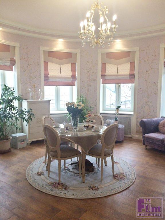 Стены в новой гостиной оформлены бесшовными фресками. Они влагостойкие с интересным и деликатным цветочным орнаментом. Люстра из Италии и шторы в «римском» стиле, которые можно зафиксировать на разной высоте, с переплетением из жаккарда также гармонично дополняют интерьер гостиной.