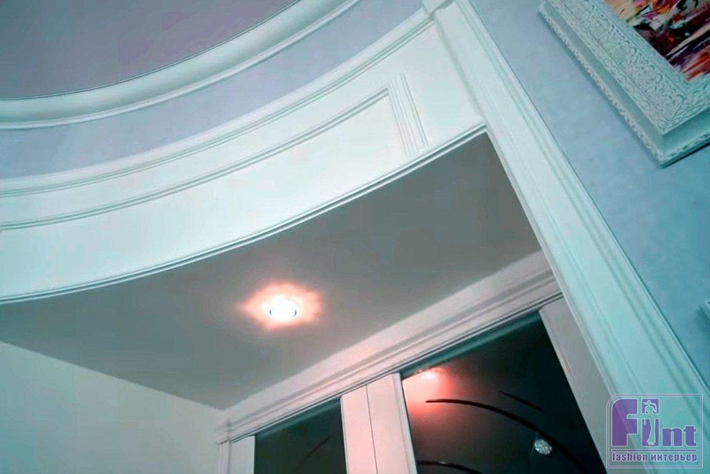 Ключевое место в гостиной занимает роскошная итальянская люстра высотой 74 см с подвесками из египетского хрусталя и деталями из гранёного муранского стекла. Дополнила обстановку светлая мебель в стиле современной классики с элементами арт-деко. Ручки шкафов-пеналов украшены хрустальными бусинами, каждая стеклянная полочка подсвечивается снизу. Фасады мебели декорированы необычными резными вставками.