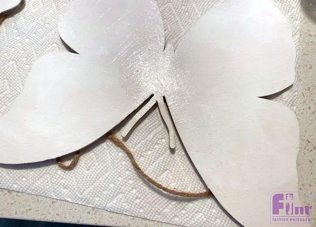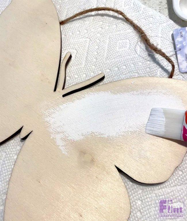 Для нашего проекта мы купили фанерную заготовку в виде бабочки в обычном магазине товаров для рукоделия. На самом деле, если у вас есть время и подходящие инструменты, такую фанерную бабочку можно без особого труда вырезать из тонкой фанеры самостоятельно. Прежде чем приступить к декупажу заготовки в виде бабочки, мы рекомендуем покрасить заготовку белой акриловой краской. Это нужно, чтобы края деревянной заготовки не слишком выделялись на фоне яркой салфетки, а также для того, чтобы древесный цвет и узор заготовки не просвечивался сквозь салфетку. Не забудьте покрасить торцевые кромки, а затем дайте краске полностью высохнуть.