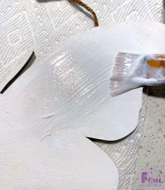 Как только краска высохнет, нанесите два слоя клея-лака для декупажа на лицевую сторону деревянной детали. Покройте заготовку полностью, чтобы придать ей красивый глянцевый блеск.