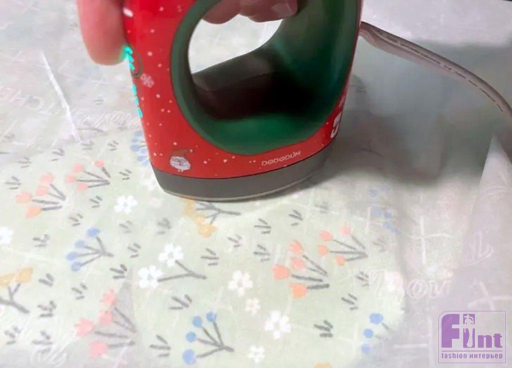 Положите лист пергаментной бумаги поверх заготовки с уложенной на неё салфеткой и несколько раз проведите по бумаге утюгом. Из-за нагрева слой клея-лака немного размягчится и салфетка надёжно приклеится к основе. Продолжайте разглаживать салфетку, пока она полностью не приклеится по всей заготовке. На такой небольшой поверхности это займет всего пару минут. Приподнимите пергаментную бумагу и проверьте, не пропустили ли вы какой-либо участок, особенно по краям. Как только вы закончите, снимите пергаментную бумагу и дайте заготовке остыть.