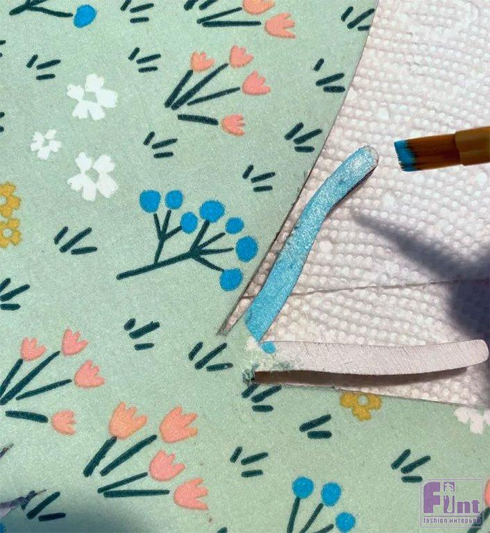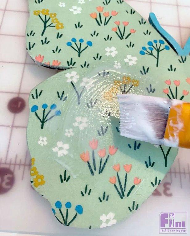 Усики бабочки довольно узкие элементы, поэтому мы решили их просто окрасить голубой краской. Старайтесь подобрать оттенок краски, хорошо сочетающийся с цветовой гаммой вашей салфетки для декупажа.