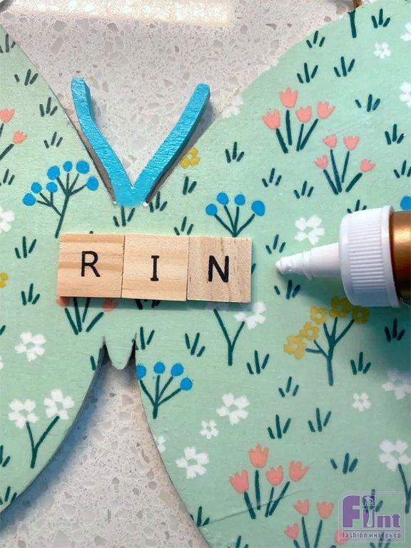 Наше панно уже выглядит потрясающе, но мы решили добавить к нему ещё слово «spring» («весна»), составленное из фишек для игры в скраббл. Эти фишки можно легко сделать самостоятельно, отпилив небольшие квадраты из тонкой фанеры и написав на них нужные буквы. Но готовые фишки, конечно же, смотрятся лучше. Наклеить фишки можно клеем для рукоделия, или клеем-лаком для декупажа, поскольку механической нагрузки на них никакой не будет.
