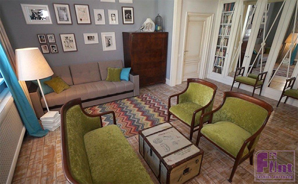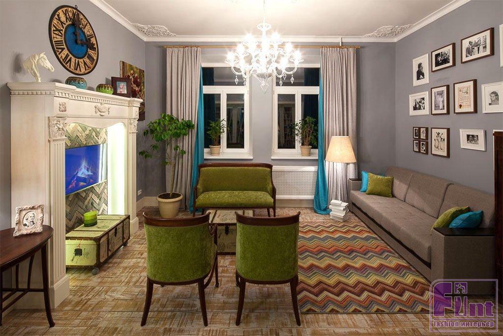 Из скромной по габаритам прихожей можно попасть в просторную гостиную. Цвет стен в гостиной серый. Белый потолок разделён со стенами плинтусом. Дизайнер решила оставить лепнину на потолке в центре, где висит основная люстра, дополнив её элементами по углам комнаты. Пол в гостиной Ирины Алфёровой выложен паркетной доской. Два больших деревянных окна завешиваются общей гардиной из струящихся двусторонних штор серого и бирюзового цвета.