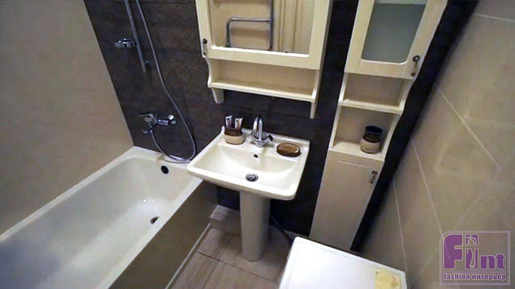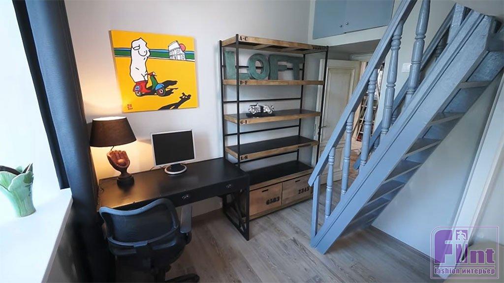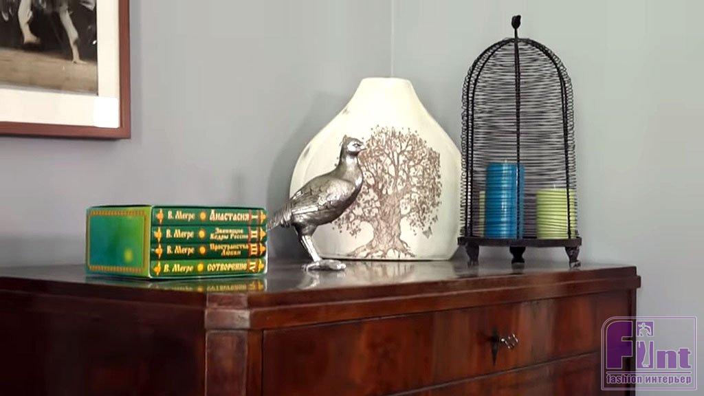 В комнате установлен искусственный камин с подсветкой, обрамленный натуральным деревом, окрашенным белой эмалированной краской. Клинкерной плитой выложена задняя часть стены камина. Над ним установлены большие часы, а рядом развешены картины. С одной стороны от камина есть столик со светильником, а с другой цветок. На месте бывших антресолей установлены белые шкафы с зеркальными фасадами.