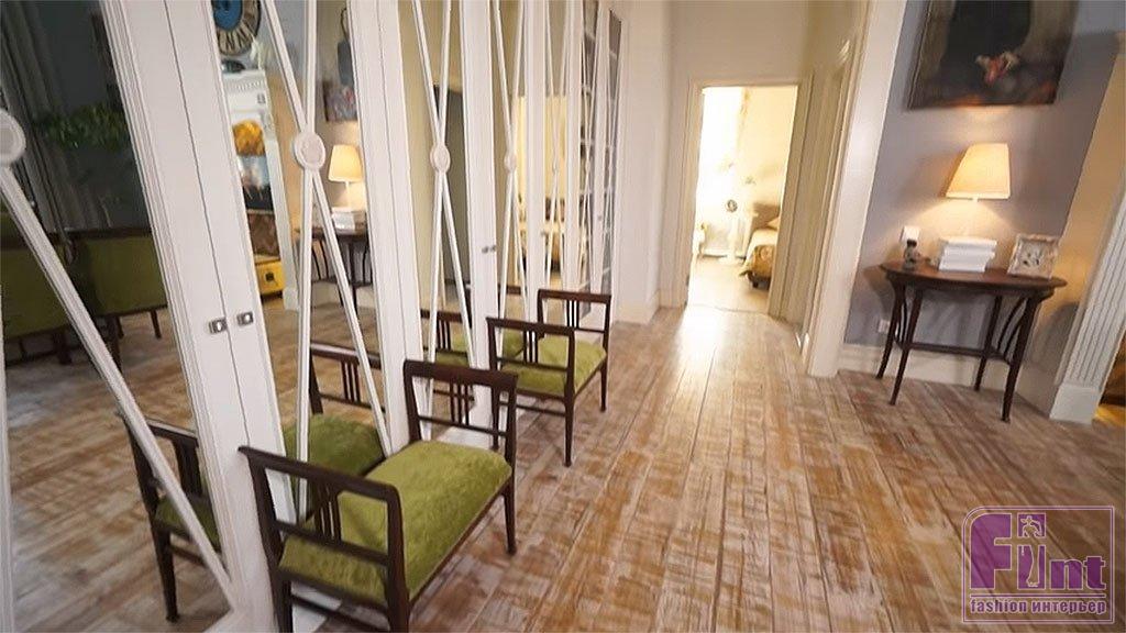 Квартира Ирины начинается с небольшого коридора. Ровные стены и потолок коридора окрашены в серый цвет. На полу уложена паркетная доска. На потолке висит современная люстра. У одной из стен разместился продолговатый комод, а над ним повешено зеркало. Коридор от остальной части квартиры отделяют светлые двери с эффектом патинирования.