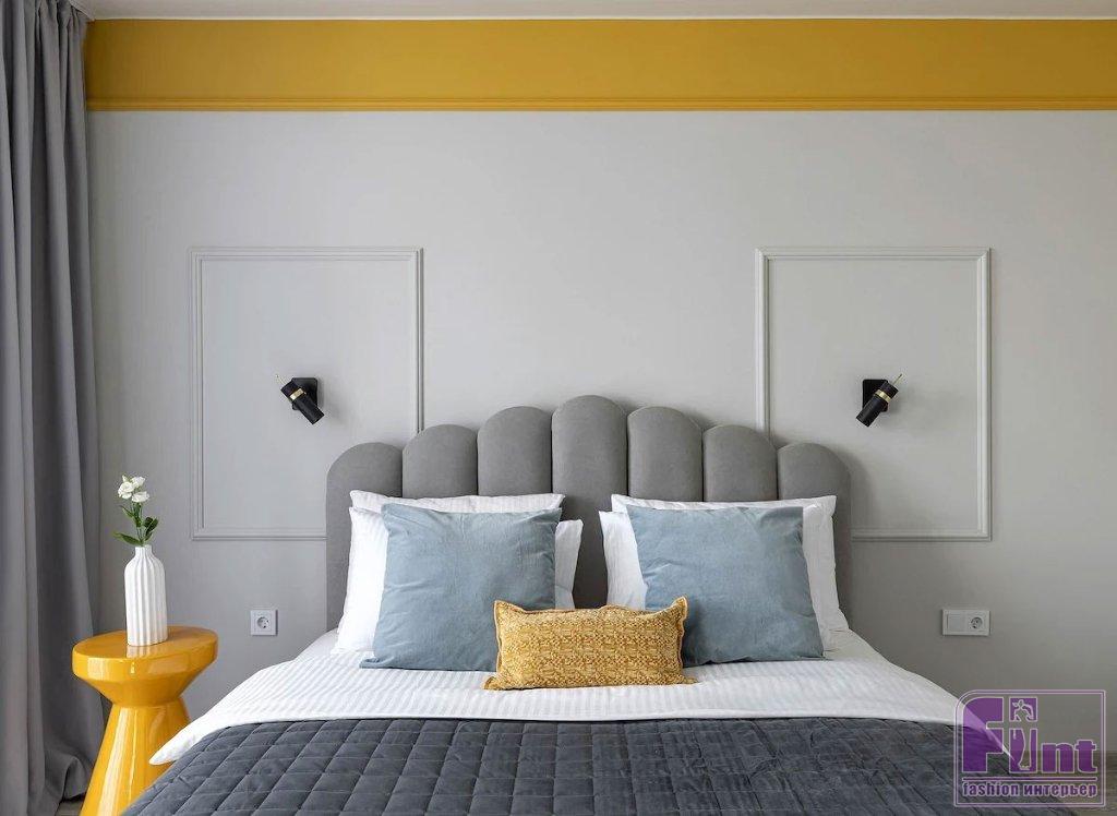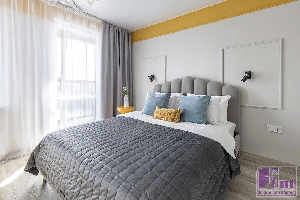 Также стены украшают рамки из молдингов — в зоне изголовья кровати и напротив неё, в ТВ-зоне. Молдинги в современном интерьере — частый прием, который добавляет лёгкого классического настроения пространству. Балкон выкрашен в оливково-серый тон, который немного охлаждает заполненное светом помещение. Основное место для хранения — это шкаф на три створки в прихожей. Дополнительно — ящики под кроватью с подъемным механизмом.