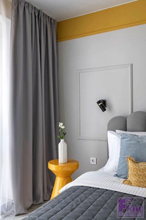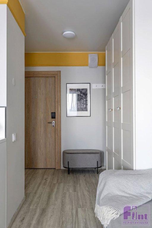 Отделку от застройщика частично оставили: на полу — кварцвинил, потолки — натяжные, а в ванной — комнате светлая плитка. Основные изменения — новая краска для стен и частичная работа с электрикой. Так, для стен выбрали светлый серый тон, но разбавили его активным жёлтым — в этот цвет окрашен небольшой участок стены по всему периметру студии под потолком. «Было любопытно увидеть игру привычного серого и жёлтого оттенков. Хочется сказать, что, несмотря на яркость второго, он абсолютно не раздражает, а наоборот, будто наполняет помещение теплотой и хорошим настроением», — комментирует выбор Виктория.