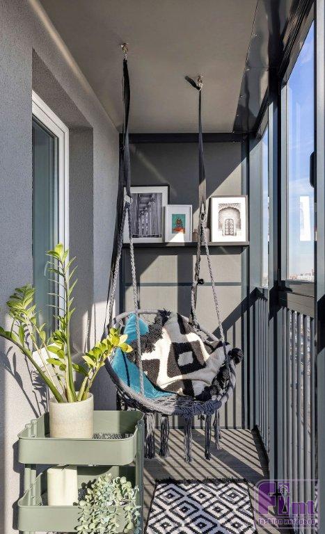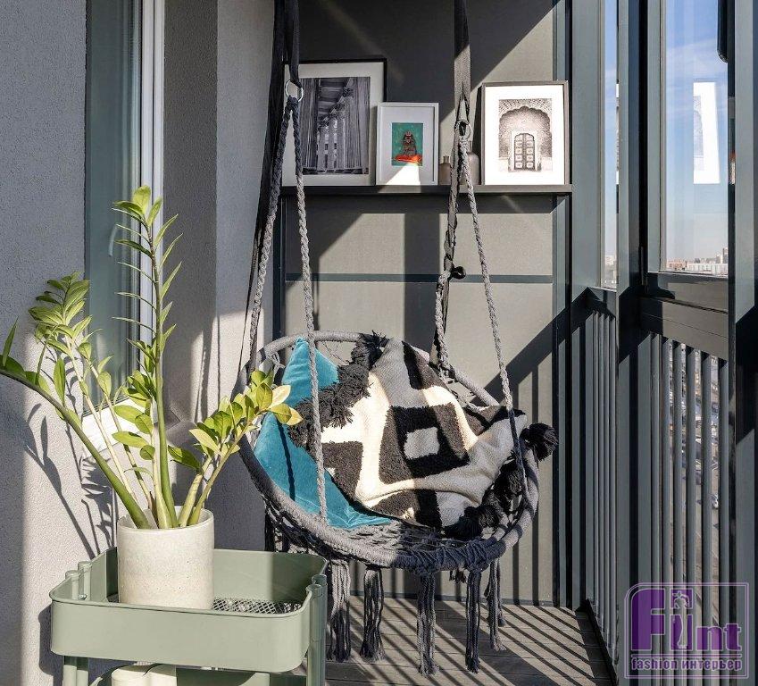 Что касается мебели — в основном, она в современном стиле. Акцентом можно считать кровать с фигурным изголовьем, которое поддерживает классические молдинги. На балконе — подвесное плетёное кресло, которое создаёт тёплую атмосферу и настроение отпуска.